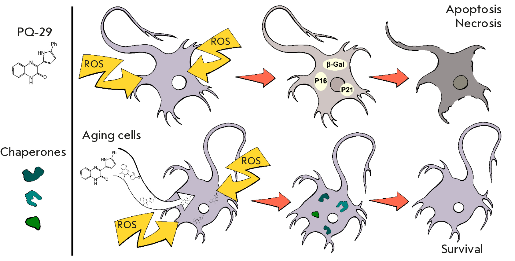 Chaperone synthesis inducers have been studied as promising neuroprotective drugs for a long time; the chaperone inducer arimoclomol is currently undergoing clinical trials [22]. However, there are no data on the effect of inducers on senescence. In this work, we propose PQ-29 as an agent capable of activating the production of the key chaperones Hsp70 and Hsp90 and co-chaperone Hsp40. The use of PQ-29 made it possible to not only inhibit the delayed cytotoxic effect of oxidative stress, but also to prevent neuronal cell senescence initiation in the presence of ROS. We would also like to note that LC50 of PQ-29 in old neurons was lower than that in neurons that had not undergone oxidative stress: 271 and 494 μM, respectively [10]. This indicates that the resistance of cells subjected to oxidative stress-induced aging decreases due to the effect of chemical agents.
