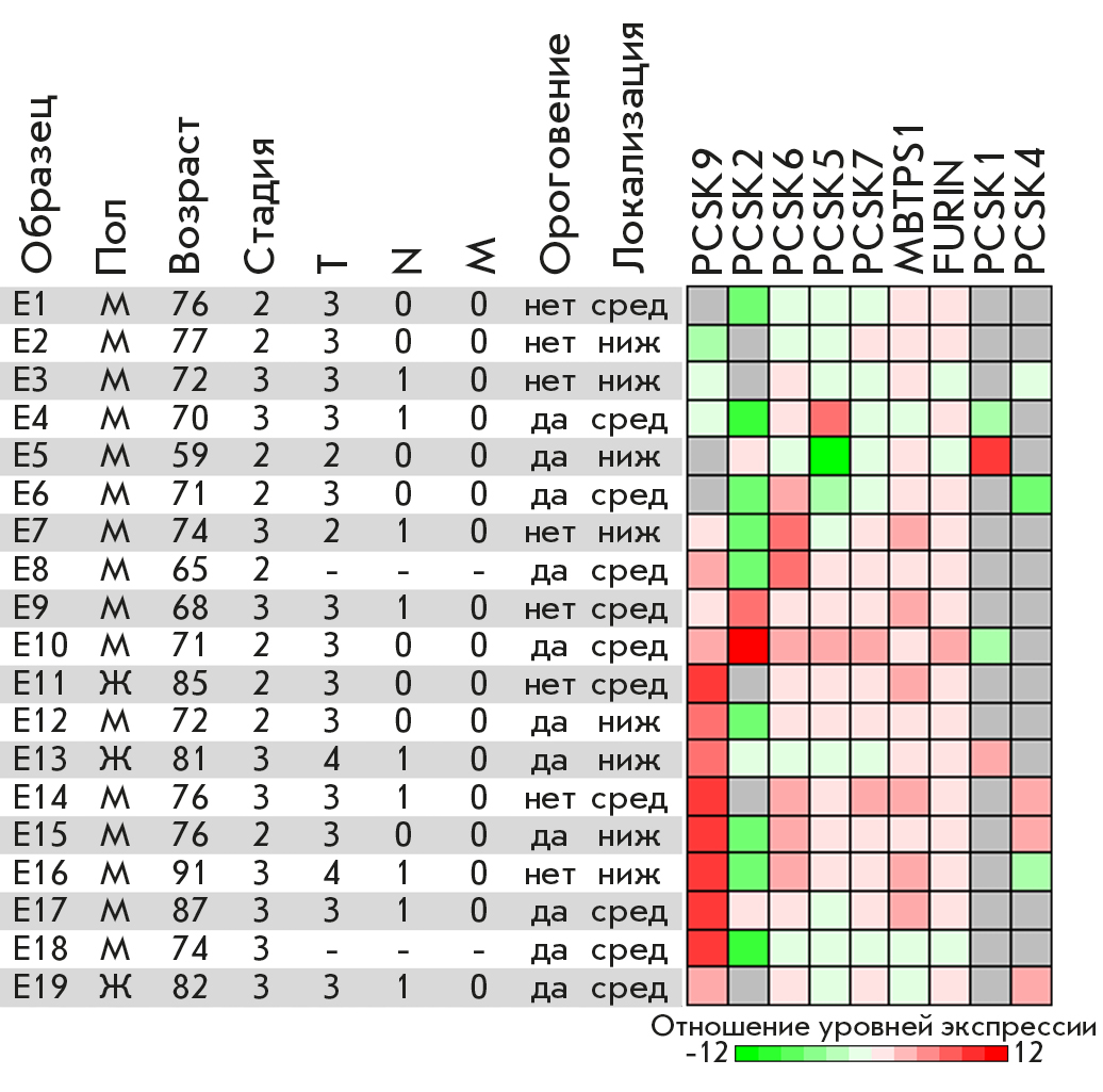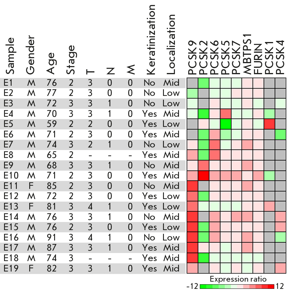 In this work, we studied esophageal malignancies in a way similar to that described above. Quantitative real-time PCR was used to analyze mRNA levels in tumor and adjacent normal tissues in samples obtained from 19 patients with esophageal squamous cell carcinoma. We found significantly increased expressions of the PCSK6, PCSK9, MBTPS1, and FURIN genes in tumor tissue, which may indicate the involvement of these PCs in the formation and progression of esophageal malignancies. We also performed a cluster analysis of PC expression alteration patterns in esophageal cancer samples and the previously analyzed lung cancer samples. As a result, a limited set of scenarios for PC expression alterations during malignant transformation of lung and esophageal cells and, probably, the cells of other organs, were identified.