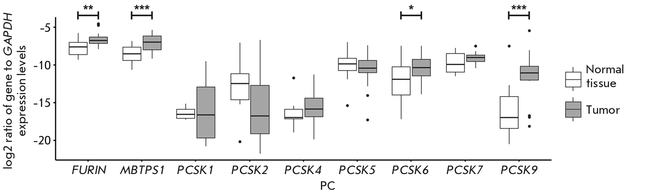 Previously, we used quantitative PCR to demonstrate that PC expression in human lung malignancies was altered compared with that in the adjacent normal tissue. In this case, we, for the first time, found that the alterations in the expression occurred in a few scenarios: 80% of the analyzed samples formed three groups, each of which displayed a significantly altered expression of one of the three genes – FURIN, PCSK1, or PCSK6 (hereinafter, we use the Human Gene Nomenclature Committee (HGNC) guidelines for gene names, https://www.genenames.org, Table 1). We did not find any correlations between the identified groups and the available clinical data of patients [13]. However, the data we obtained may be indication that there exist unidentified properties of human lung tumors which are associated with one of the three identified scenarios of alterations in the PC expression.