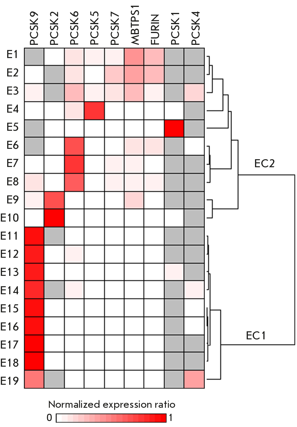 Cluster analysis of PC expression alteration patterns in esophageal tumor compared to normal tissue samples revealed two groups of samples (Fig. 3). The first group included 9 (47%) samples with significantly upregulated PCSK9 expression (Fig. 3, cluster EC1). The second group was less homogeneous (Fig. 3, cluster EC2) and included samples with significantly increased expressions of the PCSK6 (three samples, 16%), PCSK2 (two samples, 10%), PCSK1 (one sample, 5%), and PCSK5 (one sample, 5%) genes, or no significant changes in any individual gene (three samples, 16%). The PC expression alteration patterns identified in esophageal tumors differed from those we had identified previously in lung tumors [13]. For example, esophageal tumors lacked clusters with predominant alterations in the FURIN and PCSK1 expressions, which included most of the lung tumor samples (18 of 30, 60%), whereas lung tumors lacked the cluster with predominant alteration in PCSK9 expression, which was the most abundant in esophageal tumors. Meanwhile, samples with altered PCSK6 expression were detected in both nosologies. Our findings indicate that the PC expression alterations in tumor tissue compared to adjacent normal tissue differ across tumor types, but that there is a limited set of scenarios for PC expression alterations in each case.