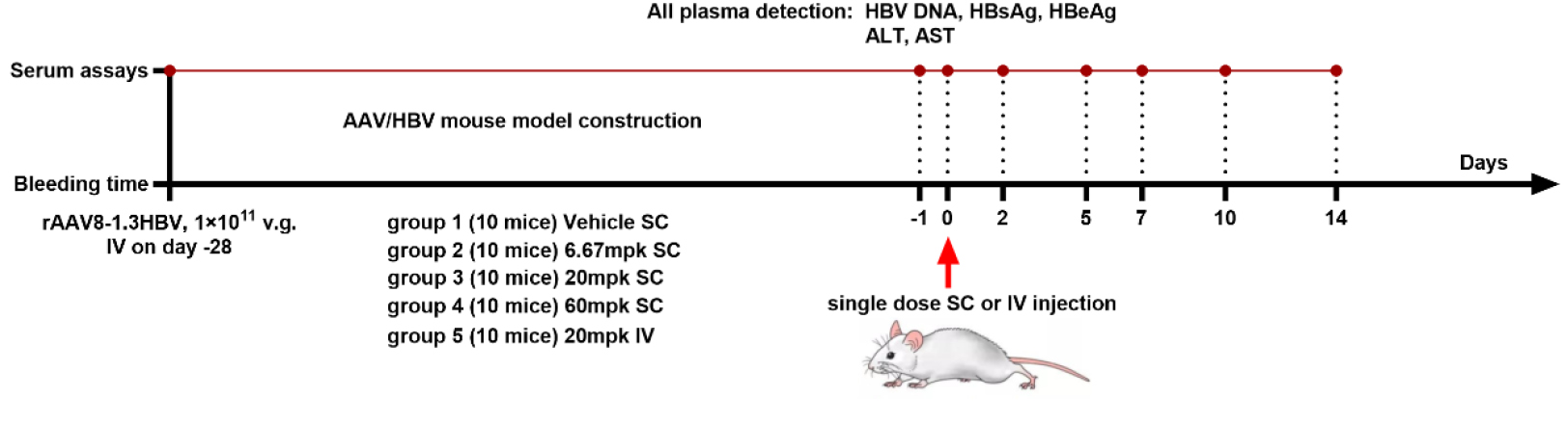 Evaluation of the anti-HBV activity by a single dose injection. Before injection, rAAV8-1.3HBV was prepared in sterile PBS at a concentration of 1 × 1011 v.g./200 µl. Injections were administered to 60 mice via the tail vein. After screening, 50 mice were divided into five groups and designated as group 1 through group 5. Blood plasma was collected before detecting HBV DNA, HBsAg, and HBeAg on days 14 and 21 after virus injection. On day 0 (28 days after virus injection), four groups of mice were subcutaneously injected with a blank vehicle or a test compound solution, while the fifth group of mice was injected with the test compound solution via the tail vein. Blood plasma samples were collected from all mice via the submandibular vein on days -1, 2, 5, 7, 10, and 14, and used to detect HBV DNA, HBsAg, and HBeAg. These blood plasma samples were also used to detect ALT and AST on days -1, 7, and 14 (Appendix, Fig. S1). The experimental protocol is shown in Fig. 1. Data are presented as mean ± standard deviation of each group of mouse samples, unless otherwise specified.