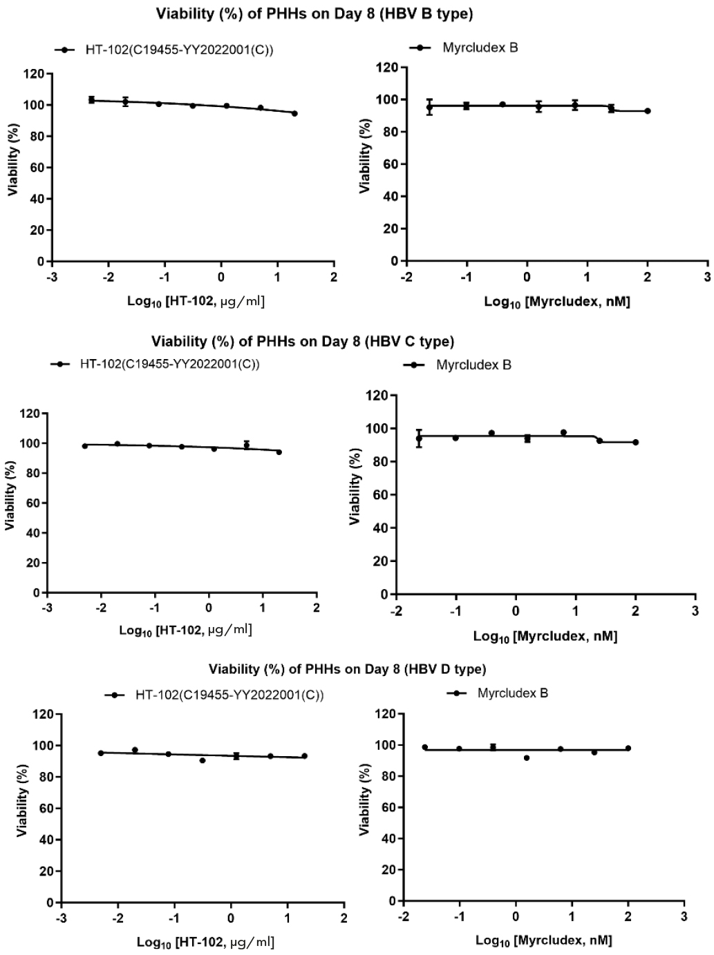 Anti-HBV efficacy. On day 0, PHH cells were recovered and adjusted to a suitable density of 1.32 × 105 cells/well before being seeded into 48-well cell plates at a concentration of 20 µg/ml. On day 1, HT-102 was prepared at starting concentrations of 20, 5, 1.250, 0.313, 0.078, 0.020, and 0.005 µg/ml to be mixed with type B, type C, and type D HBV viruses for 1 h before being added to the cells. Similarly, Myrcludex B was prepared at starting concentrations of 100, 25, 6.250, 1.563, 0.391, 0.098, and 0.024 nM. On day 8, the cell culture supernatants were collected for CCK-8 assay to determine cell viability as well as ELISA analysis for HBeAg and HBsAg detection. The HBsAg inhibition rate (%) and HBeAg inhibition rate (%) were calculated as (1 – [HBsAg or HBeAg test sample concentration / HBsAg or HBeAg medium control concentration]) × 100%, respectively. Cell viability% was determined as (test sample absorbance – blank average absorbance)/ (medium control average absorbance – blank average absorbance) × 100%. The data were analyzed using the log(inhibitor) vs response-variable slope method in the GraphPad Prism software to obtain the EC50 and CC50 values of the compound against HBV.