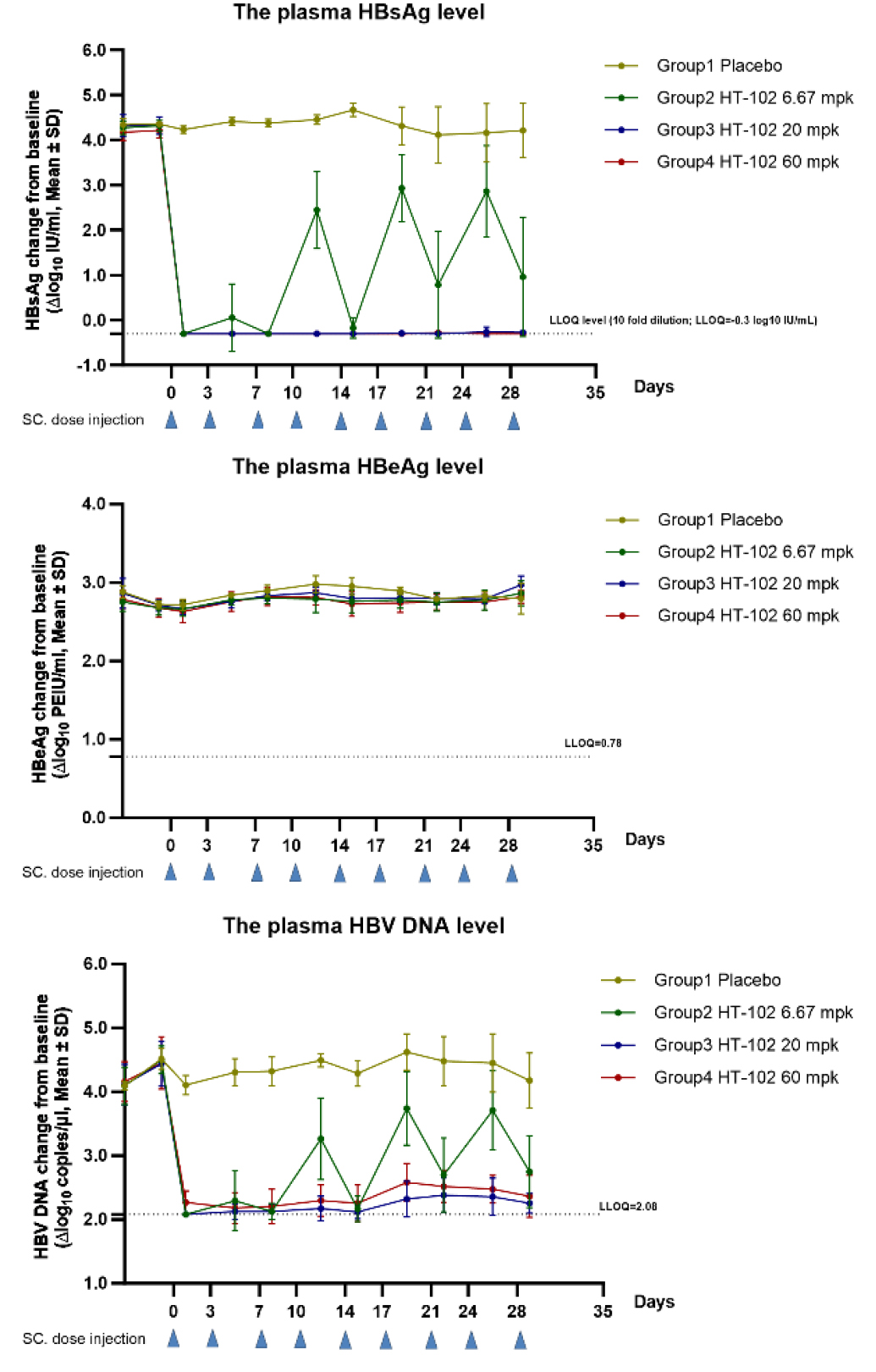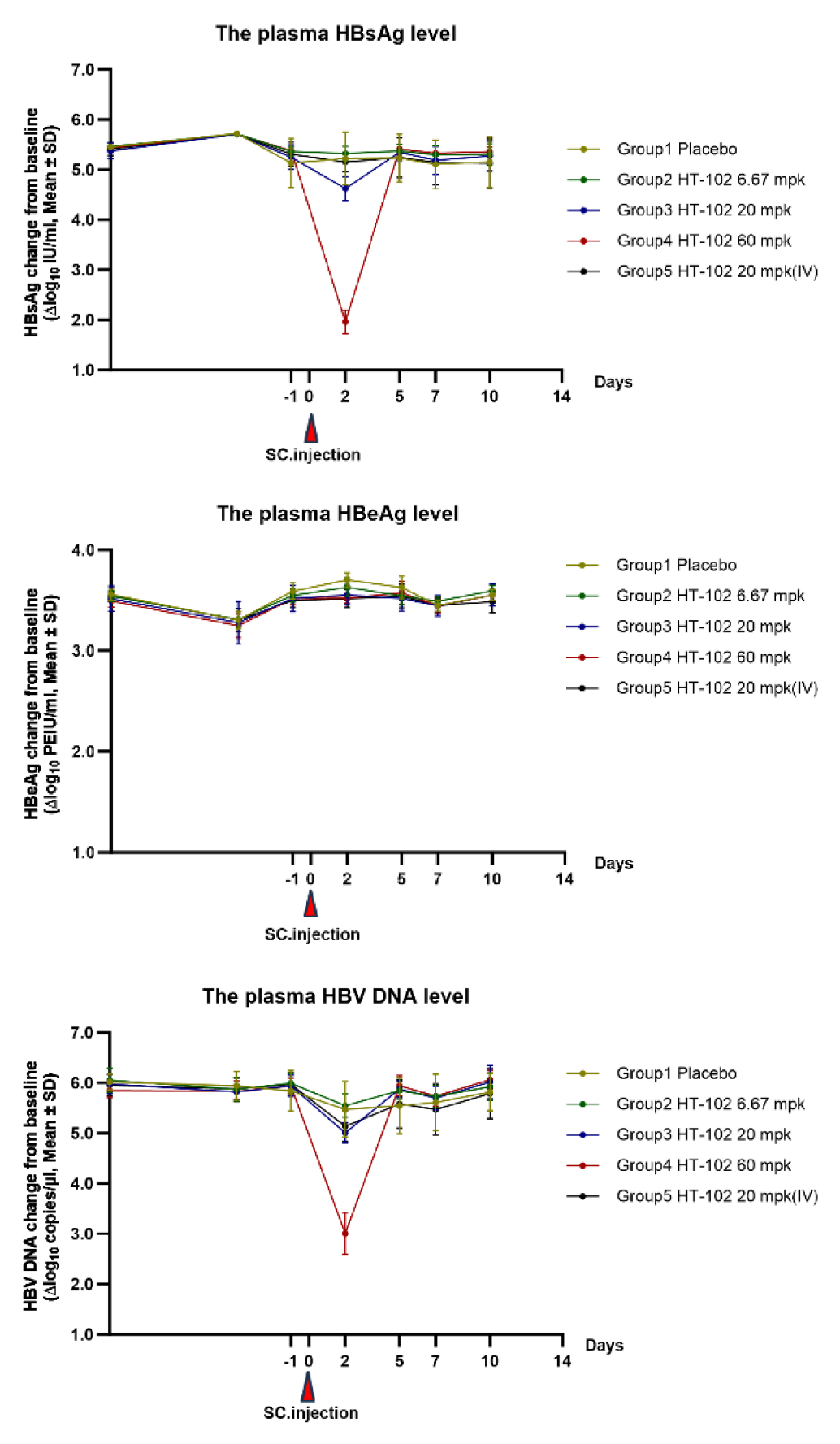 Group 2 (6.67 mg/kg, SC): HT-102 was administered subcutaneously at a dose of 6.67 mg/kg every three days. Compared to the vehicle group, the plasma HBeAg level in mice slightly decreased from day 8 to day 19 post-dose; the mean decrease ranged from 0.09 to 0.19 log10 PEIU/ml (p < 0.05). The other time points were similar to those in the vehicle group. The plasma HBsAg level in mice was significantly reduced on day 1 after the first administration and decreased to the lower limit of quantification (LLOQ); the plasma level of HBsAg fluctuated between day 5 and day 29. A significant decline was observed on days 8, 15, 22, and 29; the mean decrease was 4.67, 4.84, 3.33, and 3.26 log10 IU/ml (p < 0.01), respectively. Compared with the vehicle group, the plasma level of HBV DNA in mice was significantly lower after the first administration of HT-102; subsequently, on days 5 through 29, there were fluctuations in the plasma levels of HBV DNA related to the administration time, with a significant decrease observed on days 8, 15, 22, and 29 (the mean decrease being 2.20, 2.12, 1.78, and 1.43 log10 copies/μL (p < 0.01), respectively). Plasma levels of HBeAg in group 3 mice were slightly decreased (20 mg/kg) compared to the vehicle group on days 5 and day12 through day 19 post-dose. The plasma levels of HBsAg in mice were significantly reduced on days 1 through 29, reaching the LLOQ value. The mean decrease in the HBsAg level was between -4.42 and -4.97 log10 IU/ml (p < 0.01). In a similar manner, the plasma levels of HBV DNA in mice were significantly decreased at all time points between day 1 and day 29 compared to those in the vehicle group and slightly reduced, approaching the LLOQ value. The mean decrease in HBV DNA was between -1.92 and -2.32 log10 copy/μl (p < 0.01). In group 4 mice, the serum levels of HBeAg were slightly decreased on days 12 through 19 compared to those in the vehicle group; the mean reduction range was -0.15 to -0.23 log10 PEIU/ml (p < 0.05), while results similar to those in the vehicle group were observed for other time points. Furthermore, the serum HBsAg levels were significantly reduced on days 1 through 29, reaching the LLOQ value, the mean reduction range being -4.40 to -4.97 log10 IU/ml (p < 0.01). In a similar manner, the serum levels of HBV DNA significantly decreased from day 1 to 29 and approached the LLOQ value, with mean reduction range of -1.81 to -2.20 log10 copy/μl (p < 0.01). Detailed graphs are shown in Fig. 7.