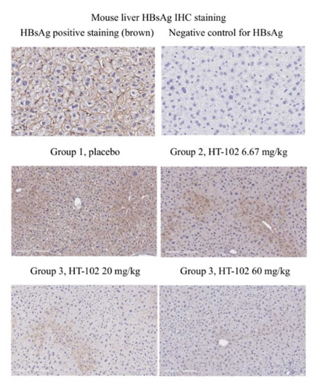 We conducted in vitro assays to evaluate the antiviral activity of the compound against hepatitis B virus (HBV) types B, C, and D. The HBeAg and HBsAg levels were quantified by ELISA, while human primary hepatocytes (PHHs) were employed for assessing the efficacy of the compound. Furthermore, no cytotoxic effects were observed within the tested concentration range. This study revealed no ADCC effect; however, HT-102 exhibited a weak and dose-dependent CDC effect. Subcutaneous administration of the test antibody at medium and high doses effectively reduced the HBeAg, HBsAg, and HBV DNA levels, being indicative of a significant dose-dependent response. Analysis of the ALT and AST levels in blood samples revealed no significant elevation in the mean post-dose levels among the treatment groups, indicating that there was no adverse impact on liver function. Furthermore, repeated subcutaneous low-dose, medium-dose, and high-dose injections effectively reduced the HBeAg, HBsAg, and HBV DNA levels, while exhibiting a favorable dose-dependent effect across all dosage groups. The immunohistochemical staining data revealed significant decline in HBsAg expression in the liver tissue samples; mice in the high-dose group exhibited the lowest HBsAg positive expression.
