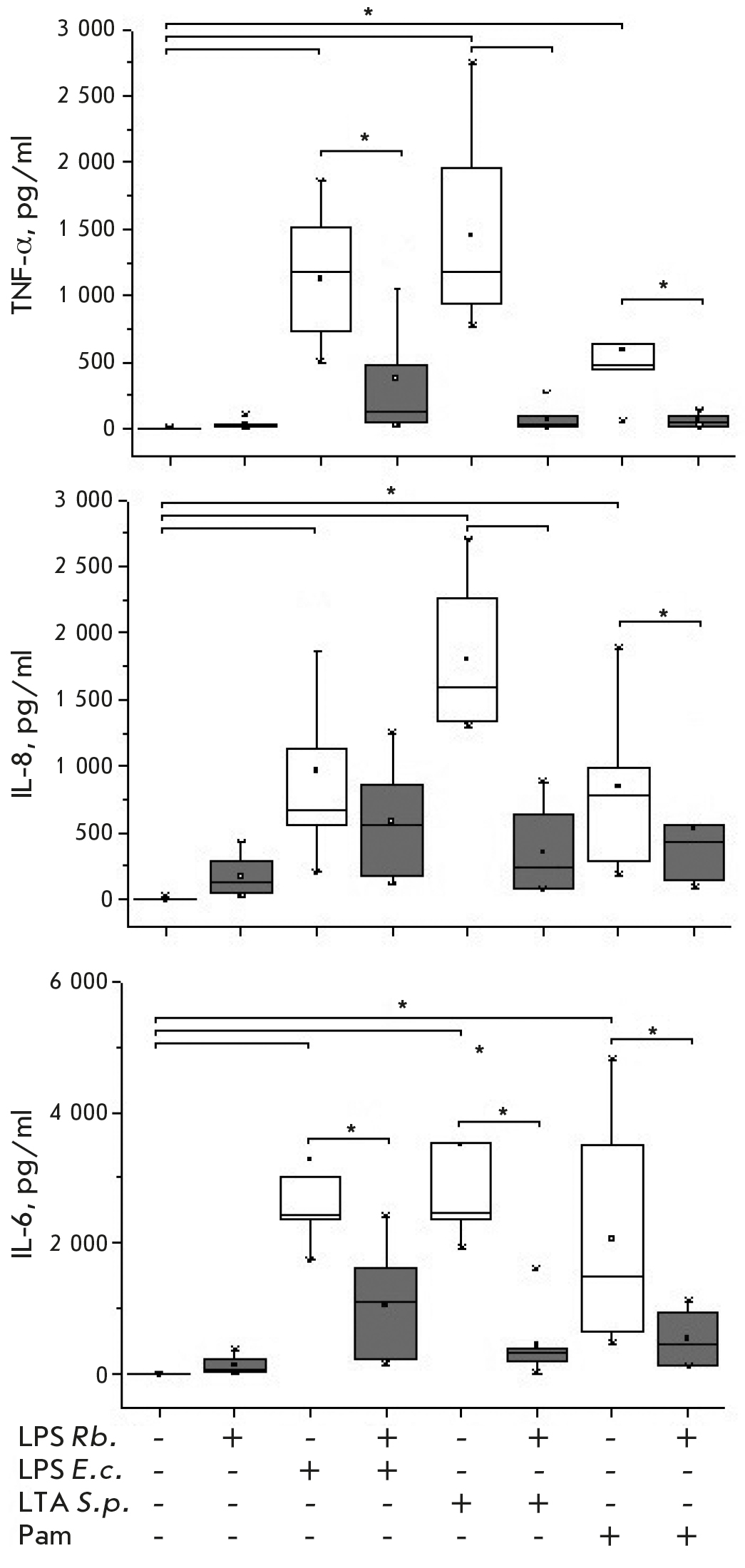 The specific receptors TLR2 and TLR4, which provide an adequate immune response to various pathogens, are the most important elements in cytokine synthesis activation. We analyzed the activation of the synthesis of the cytokines TNF-α and IL-6 and chemokine IL-8 by the following TLR2 and TLR4 ligands in human whole blood cells in a single series of experiments: E. coli LPS, S. pyogenes LTA, and Pam3CSK4. Activating ligands stimulated the production of TNF-α, IL-6, and IL-8 by blood cells at levels significantly above those in the control (Fig. 1).