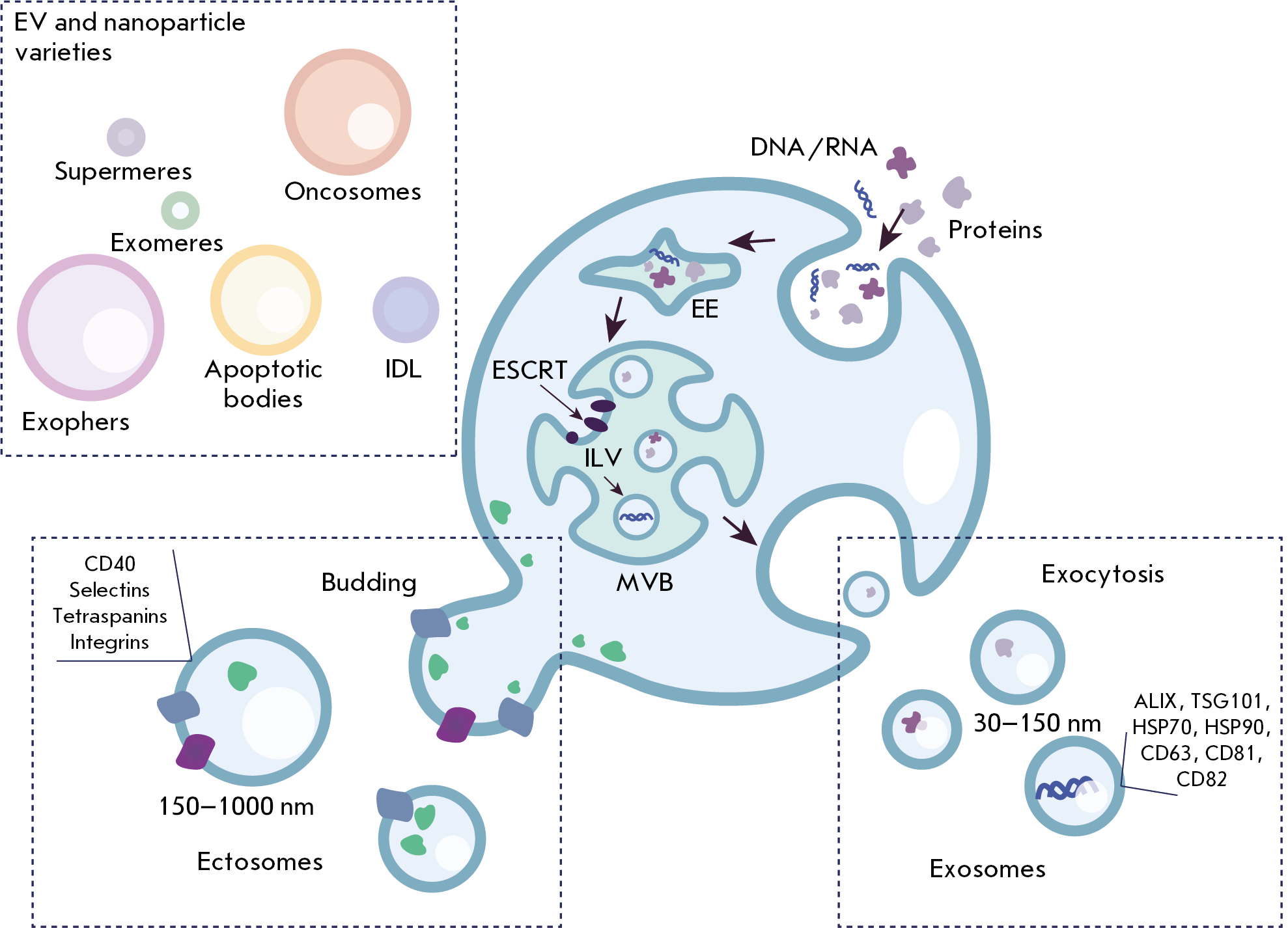 Fig. 1. Schematic of exosomes and microvesicles biogenesis. Exosomes form via the endocytic pathway that starts with the invagination of the plasma membrane and formation of early endosomes (EEs). These endosomes mature into multivesicular bodies (MVBs) containing intraluminal vesicles (ILVs). Following fusion of MVBs with the plasma membrane, ILVs are released as exosomes (30–150 nm) into the extracellular space. Microvesicles are formed by direct budding from the plasma membrane, resulting in larger vesicles (150–1,000 nm). IDL – intermediate-density lipoprotein; ESCRT – endosomal sorting complex required for transport