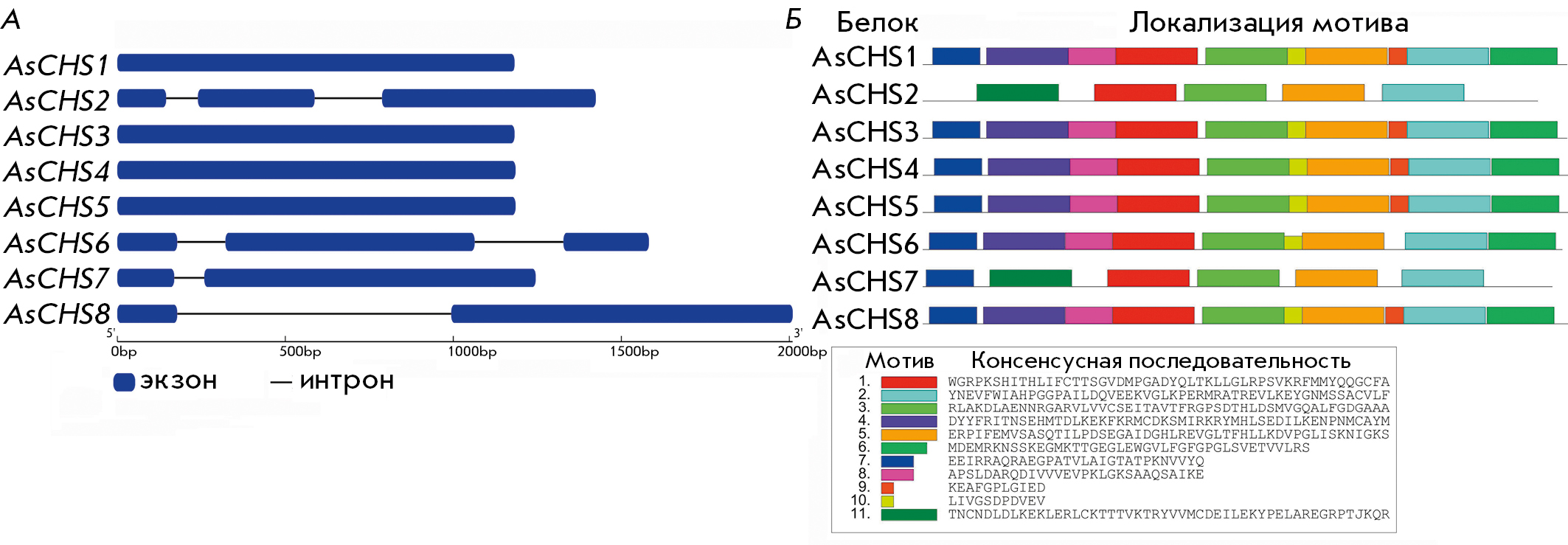 Fig. 1. The exon–intron structures of AsCHS1–8 genes (A) and the composition and distribution of conserved motifs in AsCHS1–8 protein sequences (B)