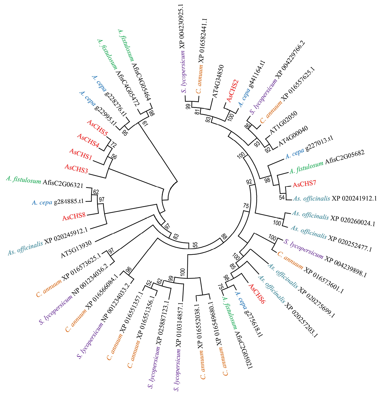 Fig. 3. The phylogenetic tree based on the amino acid sequences of chalcone synthases from A. sativum (As; red font), A. cepa (blue), A. fistulosum (green), As. officinalis (light blue), A. thaliana (AT; black), C. annuum (orange), and S. lycopersicum (purple). Significant bootstrap values (>50%) are indicated below the branches; the branch length corresponds to the number of mutations during evolution
