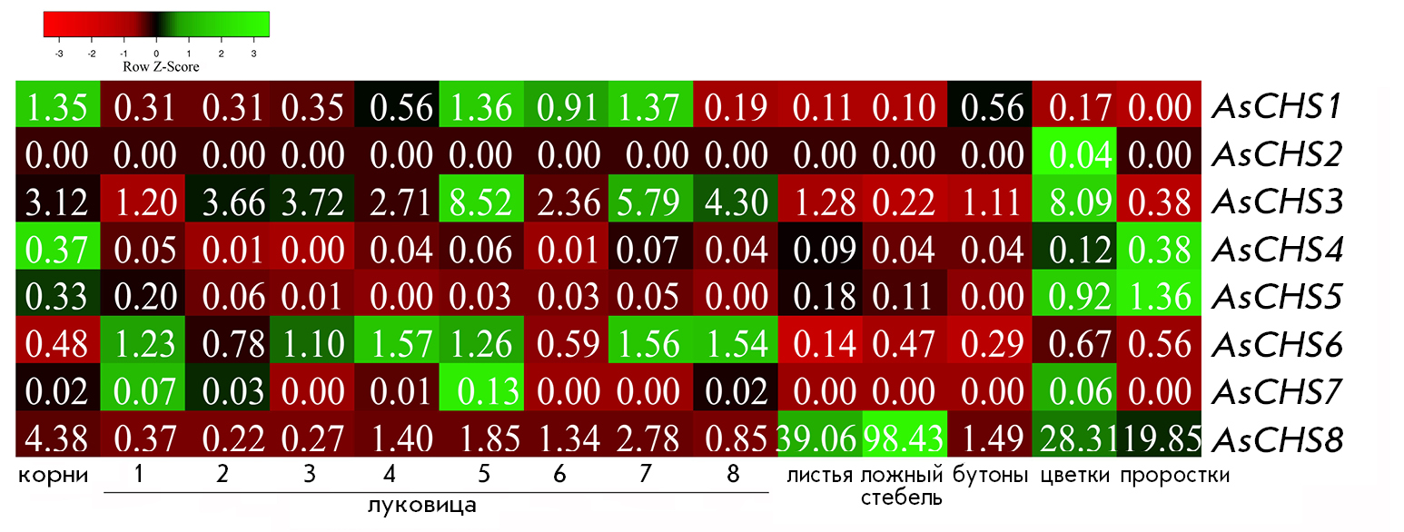 The AsCHS2 and AsCHS7 genes were found not to be expressed, except for trace numbers of transcripts in flowers (both genes), roots, and bulbs at certain developmental stages (AsCHS7). Expression of the remaining six genes was extremely insignificant in the roots, leaves, pseudostems, flowers, and during bulb development (AsCHS1, 3–6), as well as in buds (except AsCHS5) and sprouts (except AsCHS1). Among AsCHS1–7 genes, despite their low expression levels, AsCHS3 may be detected (FPKM is significantly higher than that of the other five genes, but <10) (Fig. 4).