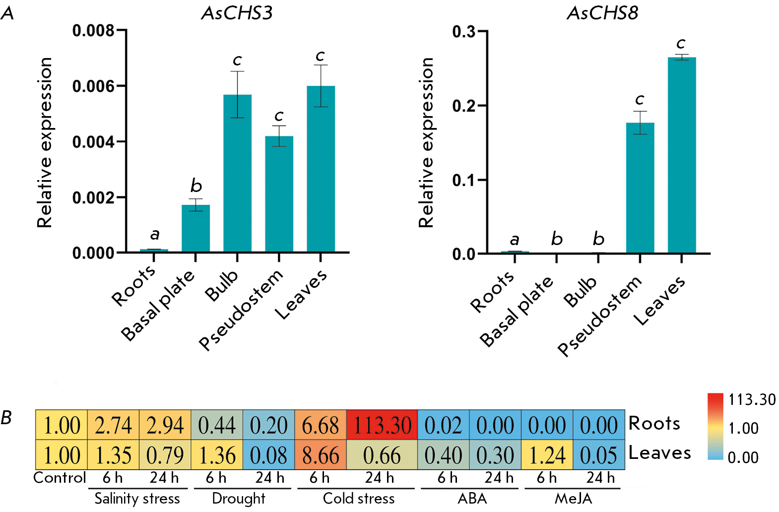 Fig. 5. (A) The expression patterns (qPCR) of the AsCHS3 and 8 genes in different organs of adult garlic plants (cv. Sarmat) (a–cp < 0.05 – significant differences in expression levels in different organs). Expression of the AsCHS1, 2, and 4–7 genes was not detected (not shown in the figure). (B) Changes in AsCHS8 expression levels in the roots and leaves of garlic plants in response to abiotic stresses (salinity, drought, cold) and exogenous phytohormones (ABA, MeJA)