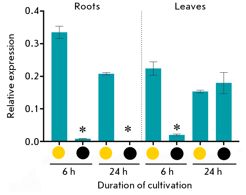 Fig. 6. Expression of the AsCHS8 gene in the roots and leaves of garlic plants after 6 and 24 h of cultivation under illumination (yellow circle) and in the dark (black circle). (*p < 0.05 – significant differences in expression levels, darkness vs. light)
