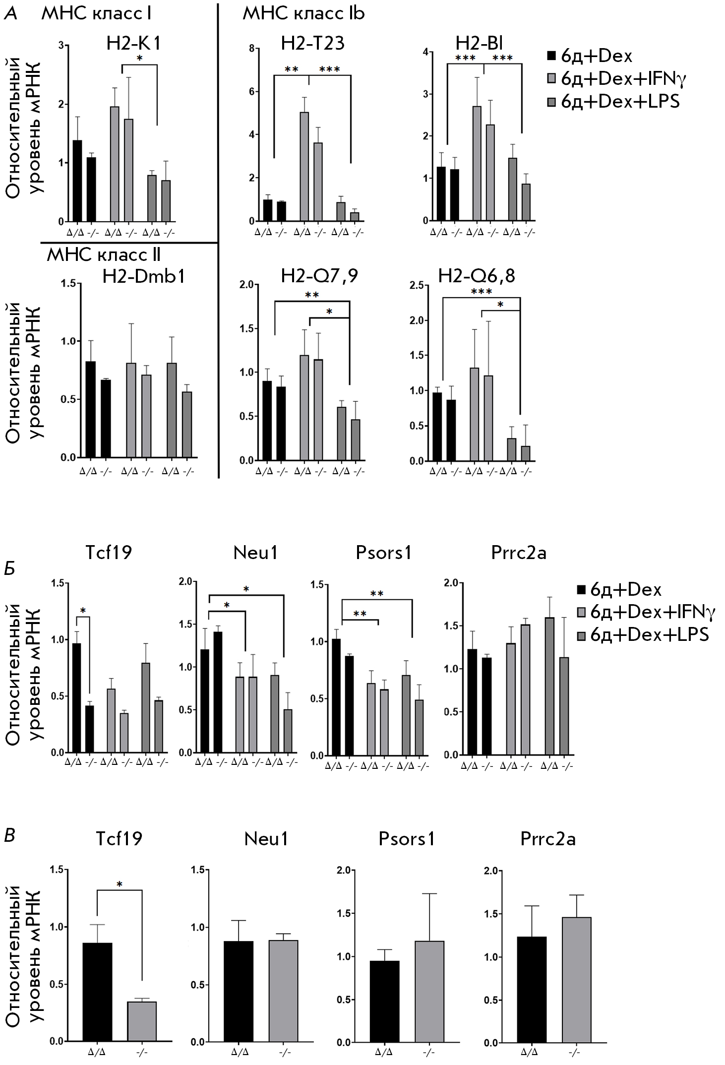 Fig. 5. Comparison of Pou5f1-MHC locus-related gene expression between the Pou5f1Δ/Δ;Rosa26Pou5f1/Cdx2 and Pou5f1-/-;Rosa26Pou5f1/Cdx2 cell lines under standard and pro-inflammatory culture conditions. (A, B) Comparison of the relative mRNA levels between the Pou5f1Δ/Δ;Rosa26Pou5f1/Cdx2 and Pou5f1-/-;Rosa26Pou5f1/Cdx2 ESC lines after six days of culture with dexamethasone (Dex) under standard and pro-inflammatory conditions (with IFNγ or LPS). Panel (A) presents the expression analysis of MHC class I and II genes; panel (B) compares the expression of the genes within the Pou5f1-MHC locus that were previously demonstrated to exhibit cis-regulatory activity towards Pou5f1. (C) Comparison of the expression of the genes from panel (B) in undifferentiated Pou5f1Δ/Δ;Rosa26Pou5f1/Cdx2 and Pou5f1-/-;Rosa26Pou5f1/Cdx2 ESCs cultured under 2i/L conditions. Figure legend is the same as that in Fig. 3A. *P ≤ 0.05; **P ≤ 0.01; ***P ≤ 0.001 according to ANOVA. Comparisons were performed between the “Δ/Δ” and “-/-” cell lines under each culture condition, as well as between different conditions using the Tukey’s test