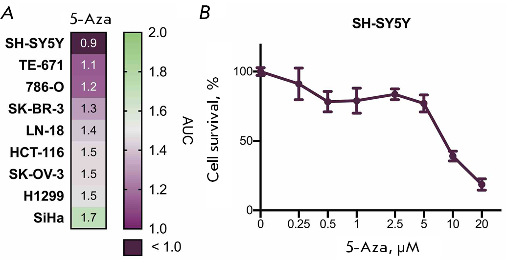Fig. 1. Toxicity assessment of 5-azacitidine for human neuroblastoma SH-SY5Y cells. (A) Sensitivity of malignant cells of different origins to 5-azacitidine (5-Aza) within 72 h. The cells were treated with the drug at concentrations of 0.25–20 µM; the figure shows the AUC (area under the curve) values. (B) Survival of neuroblastoma SH-SY5Y cells after 5-Aza treatment for 72 h. The graphs show the average value of three replicates and the standard deviation (SD). Cells incubated with dimethyl sulfoxide (DMSO) were used as controls