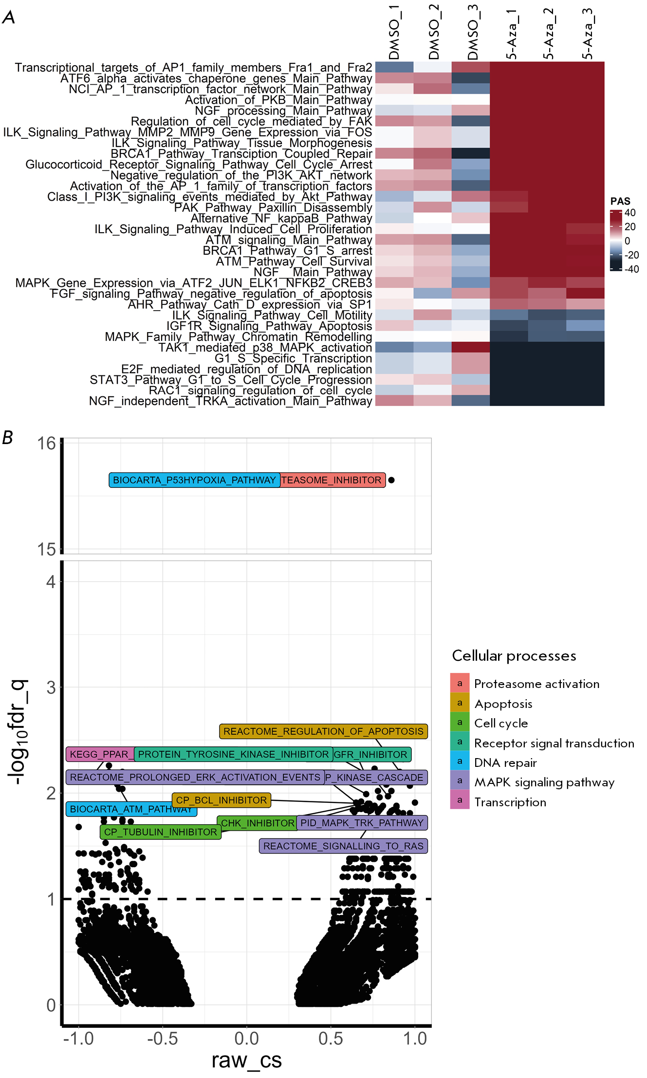 Fig. 2. Changes in the signaling pathways in human neuroblastoma SH-SY5Y cells after treatment with 5-azacitidine (5-Aza). (A) Pathway activation strength (PAS) in SH-SY5Y cells after treatment with 5 µM 5-Aza for 24 h according to the results of the Oncobox analysis [22]. The data are shown separately for each replicate. Pathway activation strength: the positive changes are shown in red; the negative changes are shown in black. The signaling pathways that may contribute to the progression of malignant tumors and incur statistically significant changes are shown. (B) Cellular processes that are altered in SH-SY5Y cells after treatment with 5 µM 5-Aza for 24 h according to the CMAP analysis. The dots indicate cellular processes from the CMAP analysis. Different colors indicate the classes of cellular processes with a reliable result according to the CMAP analysis. The results are shown as the inverse of the decimal logarithm of q-values after correction for multiple values (-log10fdr_q) and connectivity scores (raw_cs) and the degrees of similarity between differentially activated genes and the analyzed effect. Positive raw_cs values indicate identical changes in gene expression in response to treatment with 5-Aza and specified perturbations, while the negative values indicate opposite changes in gene expression in response to treatment with 5-Aza and specified perturbations