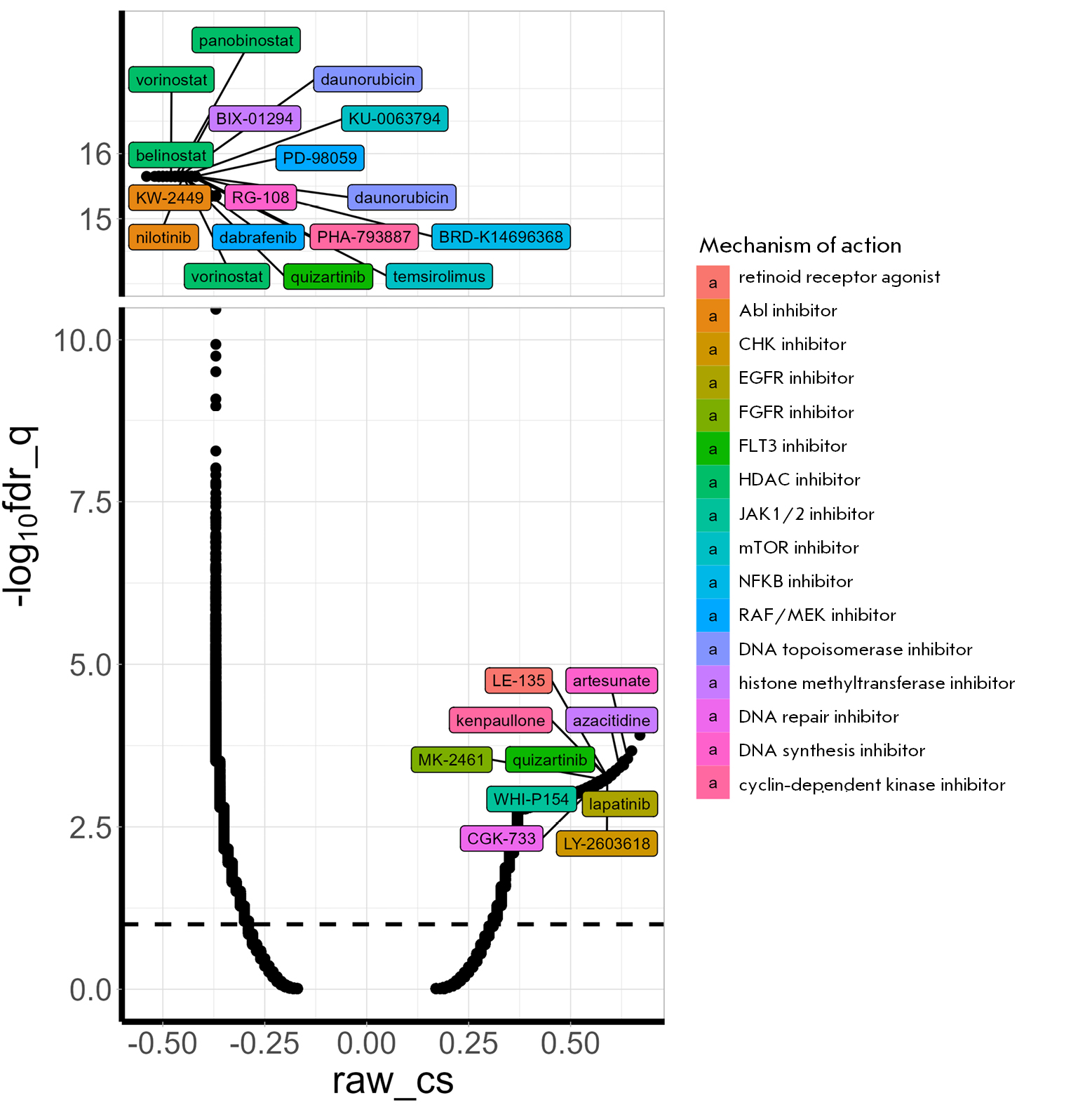 Fig. 3. Identifying drugs with an effect similar to that of 5-azacitidine (5-Aza) on the gene expression of human neuroblastoma SH-SY5Y cells using CMAP. The cells were treated with 5 µM 5-Aza and co-incubated with the drug for 24 h. The dots indicate the effects of inhibitors, small hairpin RNAs, or overexpression of certain genes. Different colors indicate the classes of inhibitors. Drugs with a statistically significant maximal effect are shown. The results are presented as the inverse of the decimal logarithm of q-values after correction for multiple values (-log10fdr_q) and connectivity scores (raw_cs) and the degrees of similarity between differentially activated genes and the analyzed effect. Positive raw_cs values indicate identical changes in gene expression in response to treatment with 5-Aza and specified perturbations, while the negative values indicate opposite changes in gene expression in response to treatment with 5-Aza and specified perturbations