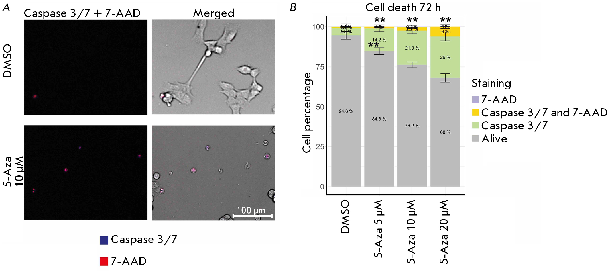 Fig. 4. The contribution of apoptosis to the death of human neuroblastoma SH-SY5Y cells after treatment with 5-azacitidine (5-Aza) for 72 h. (A) Caspase 3/7 and 7-aminoactinomycin D (7-AAD) staining in SH-SY5Y cells after treatment with 10 µM 5-Aza. (B) Apoptotic cells (green and yellow) in a population of SH-SY5Y cells after treatment with 5–20 µM 5-Aza. Cells were imaged using an automated fluorescence microscope. Cells co-incubated with dimethyl sulfoxide (DMSO) were used as control. The analysis was performed based on an assessment of the fluorescence intensity of dyes in 350–2,500 cells; the standard deviation (SD) was estimated for the average values for eight images for each 5-Aza concentration. Statistical significance was determined vs. DMSO using the Mann–Whitney U test (**p ≤ 0.01)
