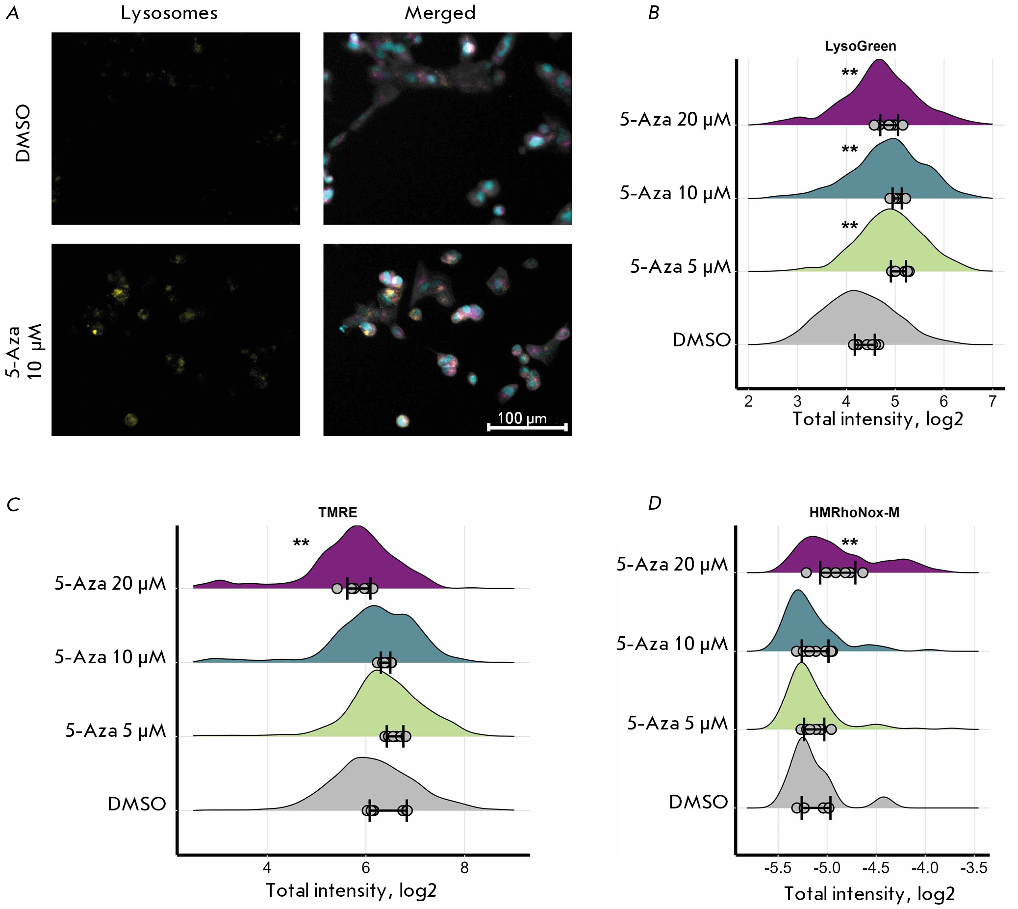 Fig. 5. Changes in the lysosomal activity in human neuroblastoma SH-SY5Y cells after treatment with 5-azacitidine (5-Aza) for 72 h. (A) Lysosome staining in SH-SY5Y cells after treatment with 10 µM 5-Aza. Cells were imaged using a fluorescence microscope. Lysosomes are shown in yellow; nuclei, in blue; mitochondria, in magenta; tubulin, in gray. (B) Changes in the lysosomal activity in SH-SY5Y cells after treatment with 5–20 µM 5-Aza. (C) Changes in the mitochondrial activity in SH-SY5Y cells after treatment with 5–20 µM 5-Aza. (D) Changes in the FeII iron content in SH-SY5Y cells after treatment with 5–20 µM 5-Aza. Cells co-incubated with dimethyl sulfoxide (DMSO) were used as controls. The distributions of the integrated dye intensity in 350–2500 cells are shown; the average values for each of the eight images are shown with dots; the standard deviation (SD) for the average values for the images is also indicated. Statistical significance was determined vs. DMSO using the Mann–Whitney U test (**p ≤ 0.01)