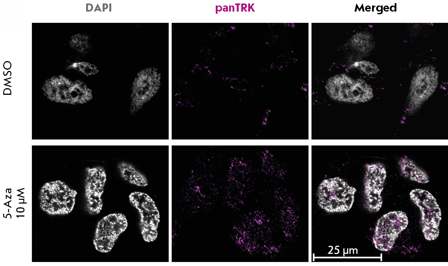 Fig. 6. The distribution of TRK proteins in the cytoplasm of human neuroblastoma SH-SY5Y cells after treatment with 10 µM 5-azacitidine (5-Aza) for 72 h. Cells co-incubated with dimethyl sulfoxide (DMSO) were used as controls. Cells were imaged by confocal microscopy using anti-TRK antibodies (Alexa647, magenta) and by staining the nuclei of fixed cells with DAPI (gray)