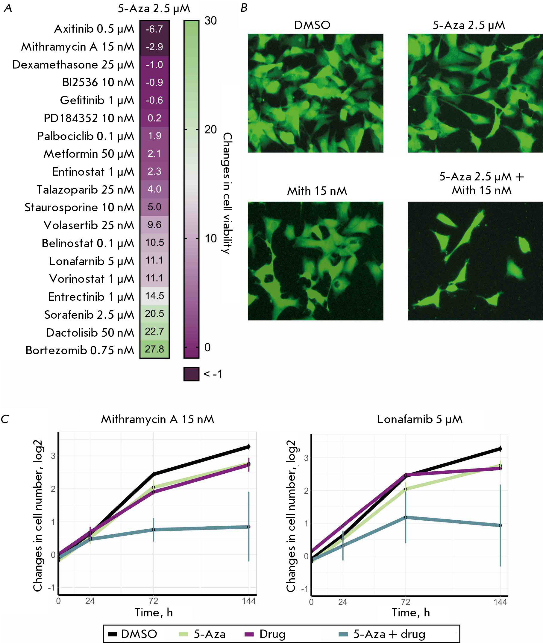 Fig. 7. The effectiveness of combinations of 5-azacitidine (5-Aza) and antitumor drugs against human neuroblastoma SH-SY5Y cells. The cells were simultaneously treated with 2.5 µM 5-Aza and an antitumor drug (the drugs and their concentrations are shown in the figure) and co-incubated for 144 h. Cells co-incubated with dimethyl sulfoxide (DMSO) were used as controls. (A) The heatmap showing the synergistic effect of a combination of 5-Aza and inhibitors belonging to different classes for SH-SY5Y cells. (B) Images of SH-SY5Y cells expressing the ERK-KTR H2B-Ruby reporter system after treatment with a combination of 2.5 µM 5-Aza and 15 nM mithramycin A (Mith) for 144 h. Cells were imaged by fluorescence microscopy. (C) The diagrams of changes in the number of SH-SY5Y cells after simultaneous addition of 2.5 µM 5-Aza and 15 nM mithramycin A or 5 µM lonafarnib. The diagrams show the average value of three replicates and the standard deviation (SD)