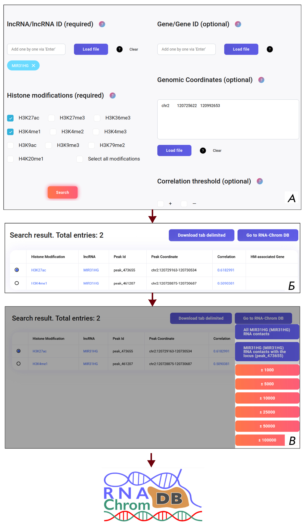 Previously, we developed the HiMoRNA database [13], which catalogues over 5 million epigenetic “peaks,” genomic regions exhibiting one of 10 histone modifications, with their modification level significantly correlating with lncRNA expression across at least 20 cell lines and tissues. Where possible, histone modification peaks in HiMoRNA are associated with genes, forming a triad: “lncRNA–epigenetic modification peak–associated gene.” Within such a triad, the lncRNA is hypothesized to modulate the expression of the corresponding gene through the promotion or repression of histone modification within the gene’s associated peak region. In the case of promotion, peaks positively correlate with lncRNA expression (“+” peaks), while in the case of repression, the correlation is negative (“–” peaks). These associations enable the formulation of hypotheses regarding the role of lncRNAs in the modulation of epigenetic modifications at specific genomic loci and the regulation of gene expression. However, to formulate and empirically test reasonable hypotheses, the 5-million-peak dataset has to be pre-processed to select the most reliable peaks. Experimental methods for detecting RNA-chromatin interactions can provide valuable data for this purpose. Several experimental methods exist to identify chromatin regions interacting with non-coding RNAs. These methods can be broadly classified into two categories: “one-to-all” [11, 14–18], which identify the contacts of a specific RNA with chromatin, and “all-to-all” [19–24], which capture all possible RNA–DNA contacts in a cell [25]. Notwithstanding their utility, these approaches are prone to high false positive rates. Additionally, “all-to-all” methods show low sensitivity to lowly expressed RNAs and bias toward nascent transcripts. Despite these challenges, genome-wide data on non-coding RNA (ncRNA) interactions with chromatin are crucial for elucidating their mechanisms of action. In this context, the RNA-Chrom database [26] was recently created. It contains experimental data on thousands of RNA-chromatin contacts and offers two analytical modes (“from RNA” and “from DNA”) that can be used for research purposes.