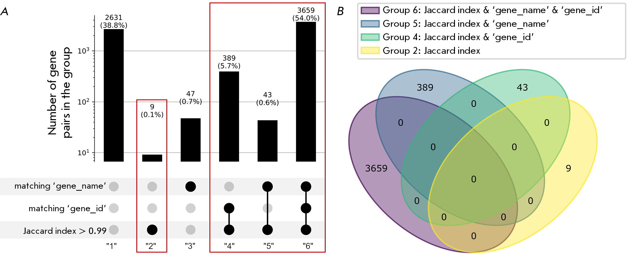 Fig. 1. Intersection of 4,145 genes from HiMoRNA with 60,619 genes from RNA-Chrom. (A) Division of gene pairs into six groups based on the similarity metrics they satisfy. Groups achieving unambiguous gene correspondence are highlighted with red rectangles. (B) Venn diagram showing the overlap between the gene groups 2, 4, 5, and 6 (the total number of gene pairs in these four groups is 4,100)