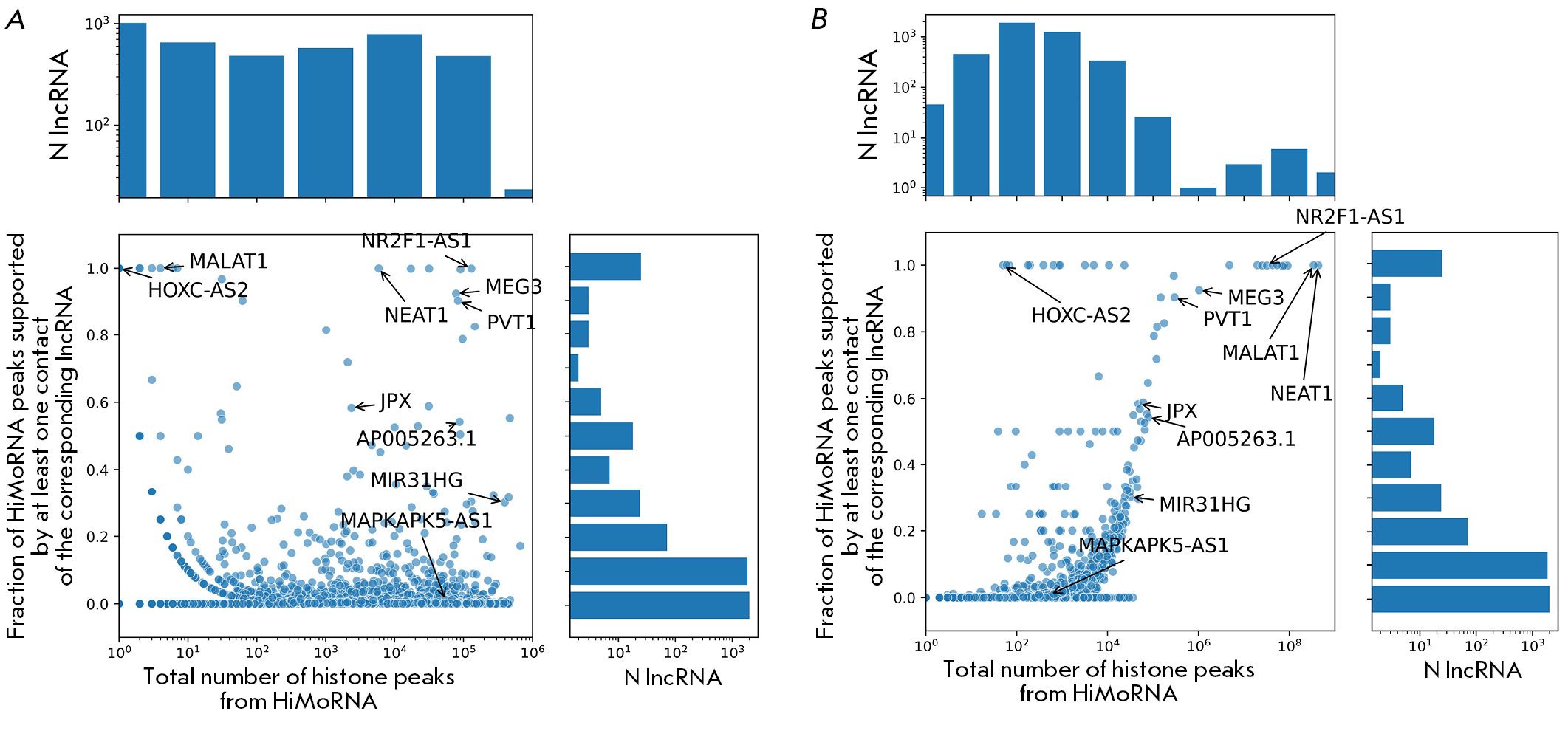 Fig. 3. Proportions of HiMoRNA peaks confirmed by at least one contact of the corresponding lncRNA from RNA-Chrom, relative to the total number of HiMoRNA peaks for the corresponding lncRNA (A) and the total number of contacts for the corresponding lncRNA from RNA-Chrom (B). Genomic coordinates of contacts are extended by ±25 kb