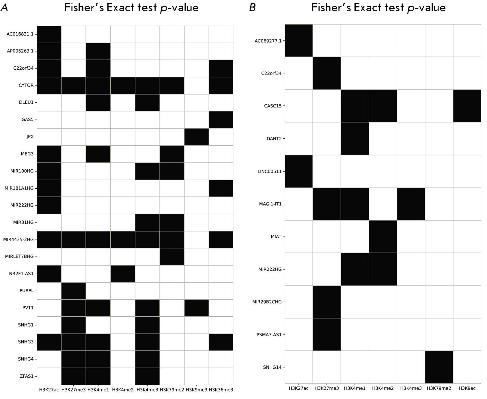 Fig. 4. Heatmap showing the results of Fisher’s exact test for pairs of “lncRNA – histone mark peaks extended by ±25 kb”. Black indicates that the proportion of “–” or “+” histone peaks supported by contacts of the corresponding lncRNA is greater than 0.4 and the p-value of the Fisher’s exact test is less than 10-3; otherwise, it is white. (A) Right-tailed Fisher’s test: “+” peaks of corresponding histone marks are better supported by RNA-Chrom contacts than “–” peaks. (B) Left-tailed Fisher’s test: “–” peaks of corresponding histone marks are better supported by RNA-Chrom contacts than “+” peaks