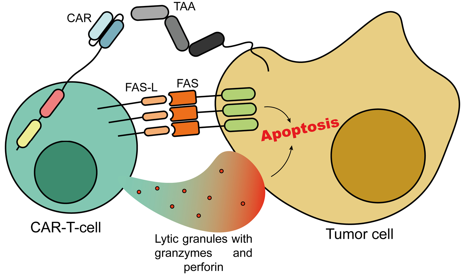Fig. 1. The mechanistic basis of CAR T-cell therapy. The interaction between a CAR T-cell and a tumor cell is enabled by the specific recognition of a tumor-associated antigen (TAA) by the chimeric receptor. This leads to the activation of the cytotoxic functions of the CAR T-cell, mediated by the release of lytic granules containing granzymes and perforin, as well as by the interaction between the Fas ligand (FASL) and Fas receptor (FAS). Consequently, apoptosis of the tumor cell is induced