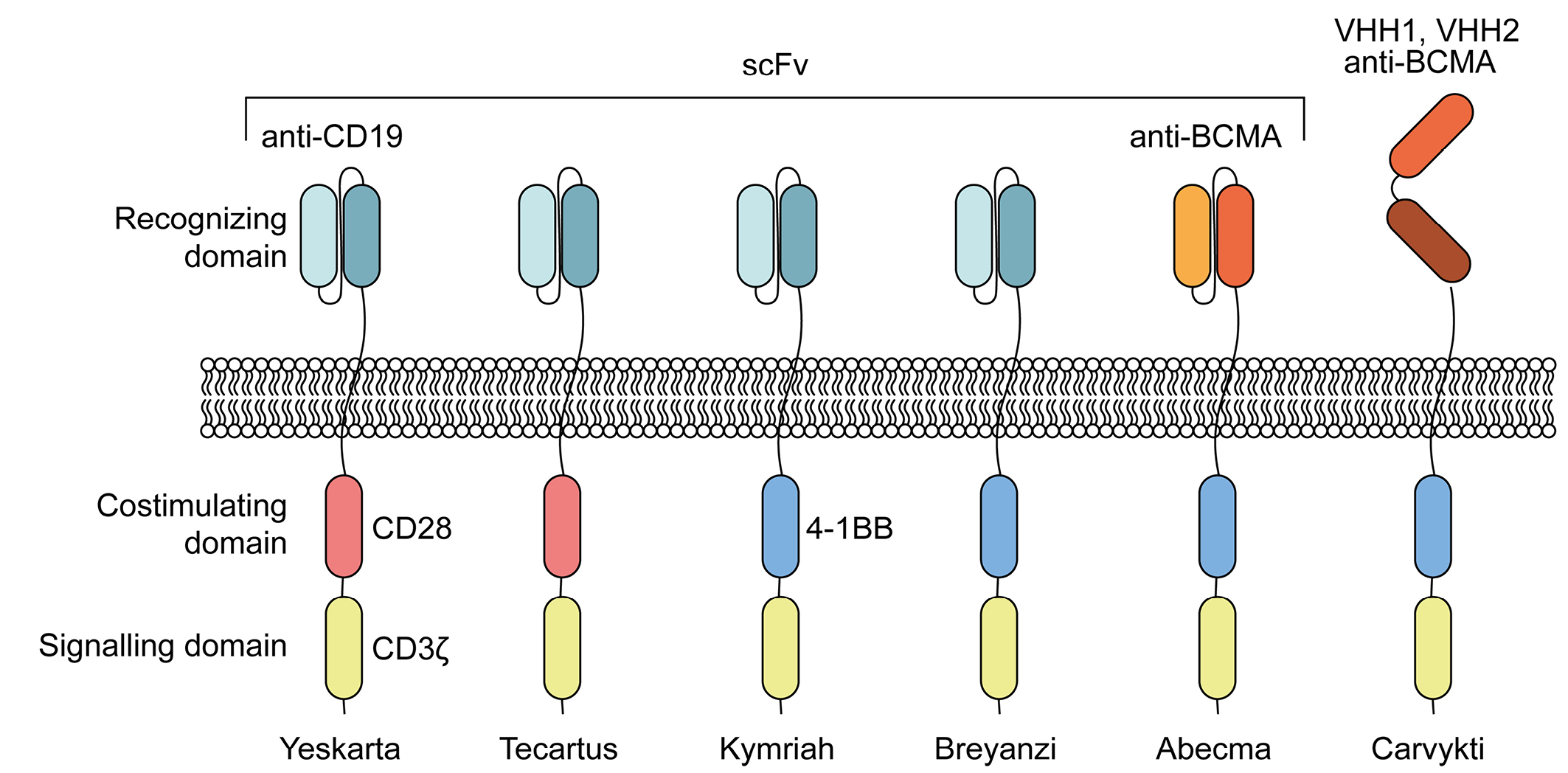 Fig. 2. Approved CAR T-cell preparations. Presented are the key domains that mediate recognition and signal transduction to intracellular partners. scFv – single-chain variable fragment; VHH – heavy chain variable domain (nanobody); CD – cluster of differentiation; BCMA – B-cell maturation antigen