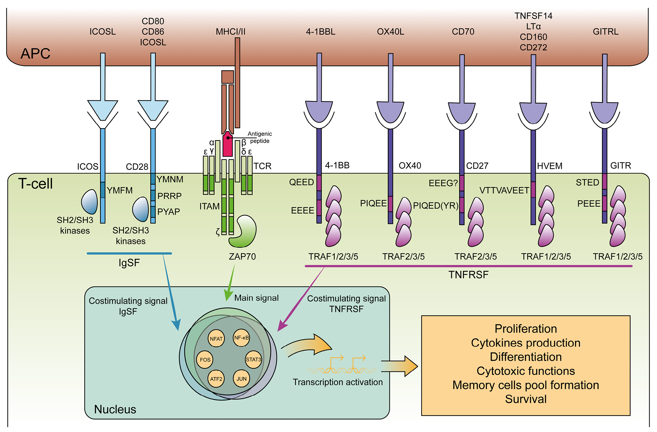 Fig. 3. Key superfamilies of T-cell costimulatory receptors. Presented is a general scheme of T-cell activation requiring both the primary and costimulatory signals, with the latter provided by TCR engagement with the major histocompatibility complex and by activating receptors from the IgSF and TNFRSF superfamilies binding their respective ligands. Amino acid sequences that are labeled in the receptors identify the primary signaling motifs. APC – an antigen-presenting cell; MHC I/II – major histocompatibility complex class I/II; IgSF – immunoglobulin superfamily; TNFRSF – tumor necrosis factor receptor superfamily; TNFSF – tumor necrosis factor superfamily; TCR – T-cell receptor; α, β – TCR recognition chains; ζ, γ, δ, ε – CD3 proteins of the TCR complex; ITAM – immunoreceptor tyrosine-based activation motif