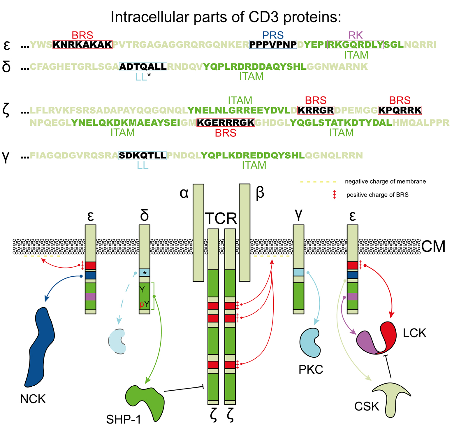 Beyond the unique amino acid sequences found in ITAM, the intracellular domains of each CD3 subunit exhibit distinctive characteristics (Fig. 4). The CD3ζ and CD3ε proteins feature segments rich in positively charged amino acids (basic-rich stretches), enabling their interaction with the inner membrane surface [87, 88]. The interaction of CD3ε with LCK kinase is mediated by ionic bonds between the BRS and acidic residues in the unique domain of LCK, and also through a receptor kinase motif (RK) and the SH3 domain of LCK [89, 90]. CD3ε also possesses a proline-rich sequence (PRS) that interacts with the adaptor protein NCK and is crucial for IC maturation and T-cell activation [91]. A proximal serine-dependent dileucine (SDKQTLL) motif within CD3γ participates in the decreasing of the number of TCRs on the cell membrane via a protein kinase C (PKC)-dependent mechanism [92]. In addition to ITAM, CD3δ contains a similar motif (ADTQALL), which lacks the serine needed for PKC interaction. Therefore, CD3δ is considered less significant in regulating the number of TKRs on the membrane than CD3γ [93].