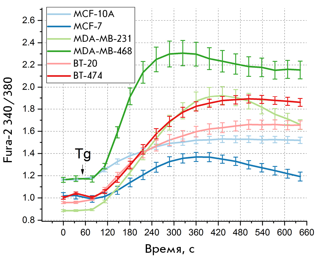 Fig. 2. The Tg-induced responses of different breast cancer cell lines in a medium containing 2 mM Ca2+. An arrow indicates the time instant of administering 1 µM Tg. The ratio between Fura-2 fluorescence (340 and 380 nm), the mean value, and SEM (n = 9–2) are shown