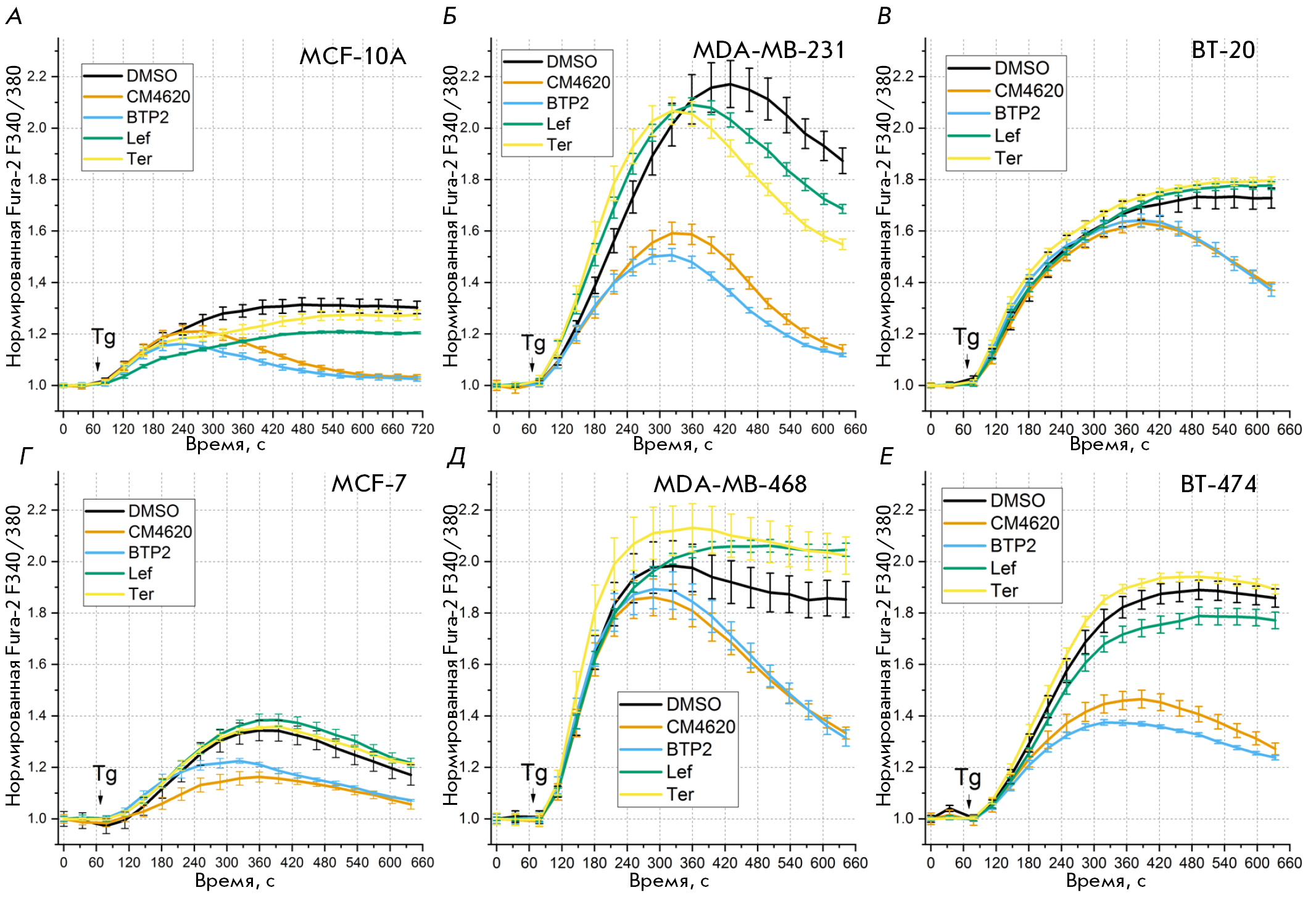 Fig. 3. Measurements of the amplitude of the Tg-induced response in the medium containing 2 mM Ca2+ after 25-min incubation in the presence of 0.5% DMSO (control), 5 µM CM4620 and BTP2, 50 µM leflunomide (Lef) and teriflunomide (Ter) in cell lines: (A) MCF-10A; (B) MDA-MB-231; (C) BT-20; (D) MCF-7; (E) MDA-MB-468, and (F) BT-474. An arrow indicates the time instant of administering 1 µM Tg. The ratio between Fura-2 fluorescence (340 and 380 nm) normalized with respect to the basal level, the mean value, and SEM (n = 9–2) as a function of time are shown. Adapted from ref. [36]