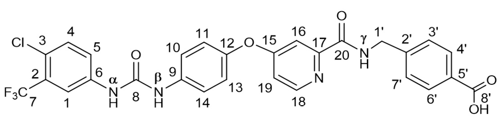 4-(4-(4-(3-(4-chloro-3-(trifluoromethyl)phenyl)ureido)phenoxy)picolinamide)methylbenzoic acid (SRF-TA). A mixture of 466 mg (1 mmol) of SRF-ME, 302 mg (2 mmol) of 4-(aminomethyl)benzoic acid, and 383 mg (2.5 mmol) of DBU in 6 mL of MeOH was stirred under boiling for 14 h. The reaction mixture was cooled to room temperature, diluted with 15 mL of H2O, and neutralized with AcOH to pH ≈ 5–6. The resulting precipitate was triturated and cooled at 10°C for 4 h. The precipitate was filtered, washed with H2O, and dried in air. The product was isolated by chromatography on a silica gel using a 5 : 1 CHCl3–EtOH mixture supplemented with AcOH (1% of the total volume) as an eluent. The collected fractions were evaporated; the residue was triturated in 10 mL MeOH, filtered, washed with 4 mL of MeOH, and air-dried to yield 269 mg (46%) of SRF-TA. 1H NMR (DMSO-d6): δ 12.82 (1H, s, OH), 9.44 (1H, t, J 6.4, NHγ), 9.20 (1H, s, NHα), 8.98 (1H, s, NHb), 8.54 (1H, d, J 5.6, H18), 8.12 (1H, d, J 2.4, H16), 7.89 (2H, d, J 8.3, H4′ and H6′), 7.70–7.57 (4H, m, H4, H10 and H14, H19), 7.45–7.37 (3H, m, H1, H3′ and H7′), 7.24–7.13 (3H, m, H5, H11 and H13), 4.54 (2H, d, J 6.3, H1′). 13C NMR (DMSO-d6): δ 167.64 (C8′), 166.51 (C15), 164.06 (C20), 152.94 (C8 or C17), 152.67 (C8 or C17), 150.93 (C18), 148.31 (C12), 145.00 (C2′), 139.79 (C9), 137.55 (C6), 132.44 (C4 or C5), 129.83 (C4′ and C6′), 129.78 (C5′),127.75 (C3′ and C7′), 127.21 (q, J 30.6, C2), 123.58 (C4 or C5), 123.29 (q, J 273, C7), 122.83 (C3), 121.91 (C10 and C14), 121.01 (C11 and C13), 117.33 (q, J 5.6, C1), 114.78 (C19), 109.46 (C16), 42.78 (C1′). 19F-NMR (DMSO-d6): δ ‒61.45 (CF3).
