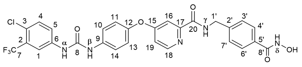 (E)-4-((2-(4-(4-(3-(4-chloro-3-(trifluoromethyl)phenyl)ureido)phenoxy)picolinoyl)hydrazinoylidene)methyl)-N-hydroxybenzamide (SRF-H-BHA). A solution of 85 mg (0.515 mmol) of 4-formyl-N-hydroxybenzamide [9] in 3.5 mL of MeOH–CH2Cl2, 5 : 2, and 30 μL of AcOHcat was added to a suspension of 233 mg (0.50 mmol) of SRF-H in 3 mL of a 2 : 1 MeOH–CH2Cl2 mixture, and the mixture was stirred for 5 min until the starting compound had dissolved. After 4 h, the resulting precipitate was filtered, washed successively on a filter with 10 mL of EtOH and 5 mL MeOH, and air-dried to yield 258 mg (84%) of SRF-H-BHA. 1H NMR (DMSO-d6): δ 12.23 (1H, s, NHγ), 11.27 (1H, s, NHd), 9.25 (1H, s, NHα), 9.08 (1H, s, OH), 9.04 (1H, s, NHb), 8.69 (1H, s, H1′), 8.60 (1H, d, J 5.6, H18), 8.13 (1H, d, J 2.2, H16), 7.84 (2H, d, J 8.4, H3′ and H7′), 7.71 (2H, d, J 8.4, H4′ and H6′), 7.71–7.59 (4H, m, H4, H10 and H14, H19), 7.50 (1H, d, J 2.5, H1), 7.25–7.18 (3H, m, H5, H11 and H13). 13C NMR (DMSO-d6): δ 166.56 (C15), 164.14 (C8′), 160.49 (C20), 152.96 (C8), 152.23 (C17), 151.04 (C18), 148.98 (C1′), 148.27 (C12), 139.80 (C9), 137.62 (C6), 137.23 (C2′), 134.46 (C5′), 132.48 (C4 or C5), 127.93 (C3′ and C7′), 127.47 (C4′ and C6′), 127.21 (q, J 30.7, C2), 123.63 (C4 or C5), 123.30 (q, J 273, C7), 122.86 (d, J 1.3, C3), 121.94 (C10 and C14), 121.05 (C11 and C13), 117.35 (q, J 5.7, C1), 115.16 (C19), 110.14 (C16). 19F NMR (DMSO-d6): δ ‒61.43 (CF3).