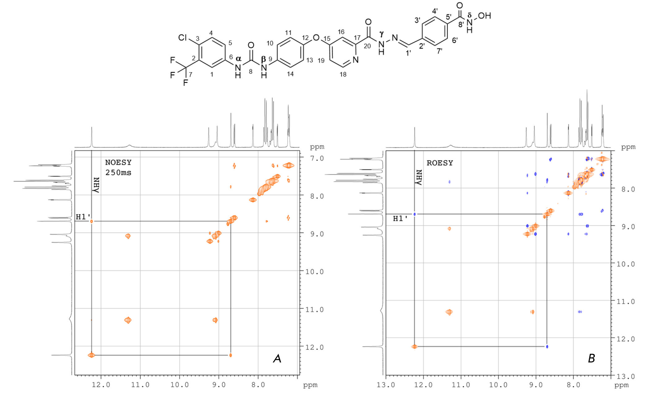 To confirm that the produced SRF-H-BHA is an (E)-isomer, we measured two-dimensional NOESY correlation spectra [16] (Fig. 3A), which revealed an intense positive cross-peak at (12.23, 8.69), which corresponds to the interaction of H1′ and NHγ protons. Since the molecular weight of the substance occurs in the range between 0.5 and 1.0 kDa, where the nuclear Overhauser effect (NOE) changes its sign (ωτc ~ 1), and the observed dipole‒dipole cross peaks cannot generally be distinguished from the exchange peaks by their sign, we measured the ROESY spectrum [17] (NOE in a rotating coordinate system, Fig. 3B), where an intense negative cross peak at (12.23, 8.69) was also observed, which clearly confirmed its dipole‒dipole nature. The molecular models of SRF-H-BHA (data not shown) demonstrate that the distance between H1′ and NHγ protons in the (E)-isomer is approximately 0.25 nm, which corresponds to the strong NOE observed in the two-dimensional correlation spectra. At the same time, in the (Z)-isomer, it is 0.37 nm and occurs near the experimental detection limit of NEO. Therefore, the probability of detecting intense cross-peaks is negligible.