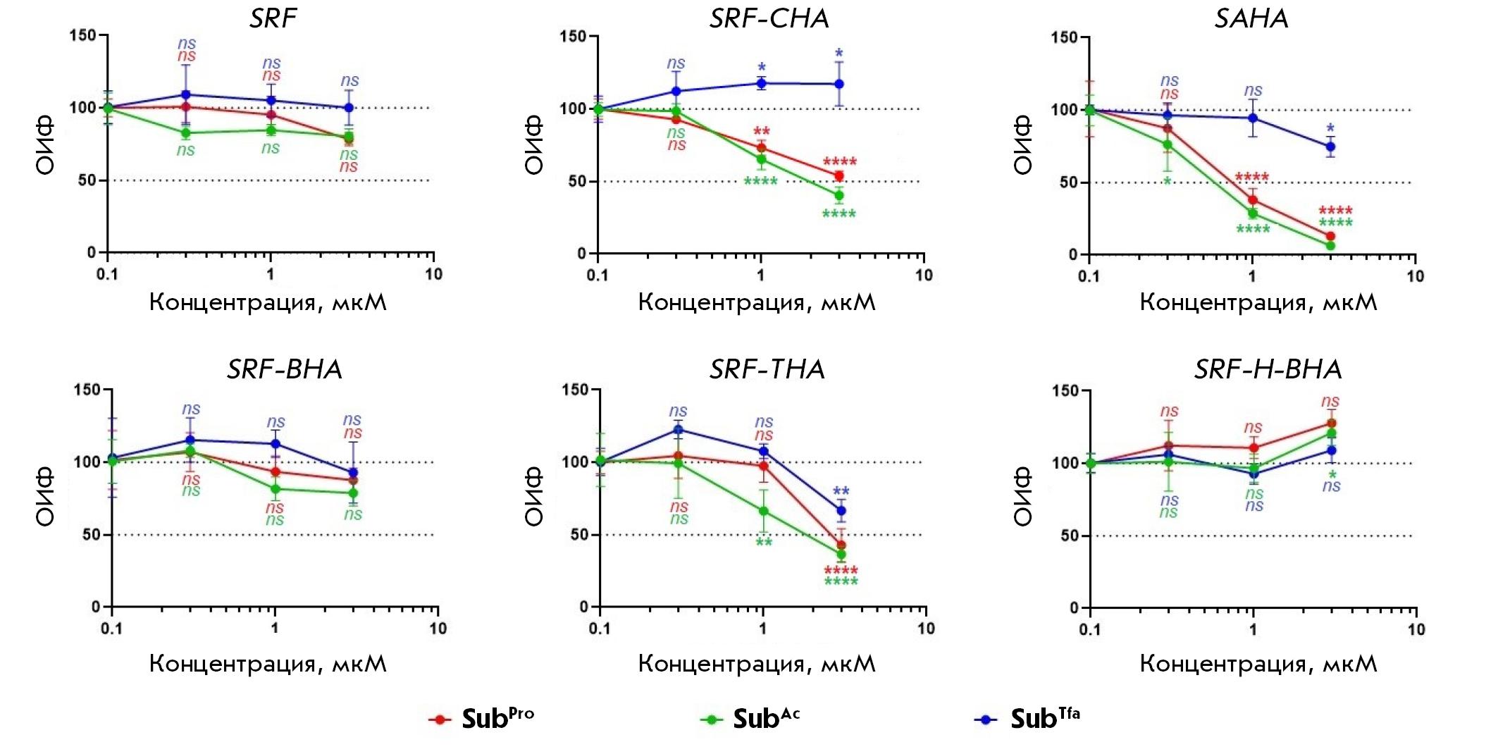 SRF, SRF-BHA, and SRF-H-BHA were found not to inhibit in-cell histone deacetylase activity up to a concentration of 3 μM (Fig. 4). However, SRF-CHA and SAHA, with the latter a stronger inhibitor, demonstrated the same selectivity as class I and IIb HDAC inhibition. Finally, pan-inhibition of histone deacetylase activity was observed in the presence of SRF-THA. However, the simultaneous decrease in three fluorescent signals observed in this case might point to a malfunction of the s3CTS test system due to additional inhibition of zinc-dependent palmitoyl-CoA thioesterase MBLAC2. It is worth noting that this effect is often observed precisely in the case of selective toluylhydroxamic inhibitors of HDAC6 class IIb, including tubastatin A and nexturastat A [12, 18].