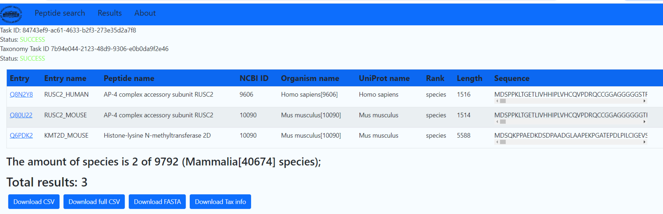 На рис. 2 приведен пример вывода результатов. Результаты отсортированы по названию организма. Пользователь может сохранить результат запроса в форматах FASTA или CSV. Поиск 3-аминокислотного фрагмента в базе данных SwissProt занимает несколько секунд, в то время как в базе данных UniprotKB – от 10 мин до нескольких часов.