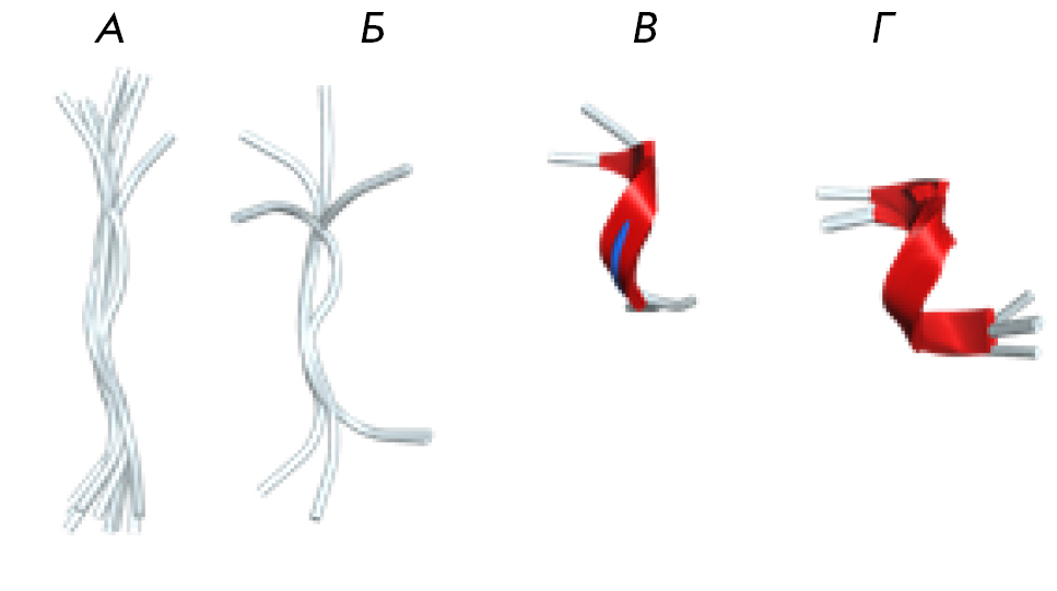 Нами рассмотрено расположение сайта EVHH в структуре белков и его конформацию. Конформации сайтов EVHH в структурах белков человека образуют четыре кластера (рис. 3). Самую близкую к структуре цинксвязывающего домена Aβ конформацию имеет сайт EVHH миомезина. Найдена также ассоциация миомезина-2 с болезнью Альцгеймера. Изучение кардиомиопатии у трансгенных мышей показало, что агрегаты, присутствующие в больных сердцах и образованные небольшим белком теплового шока α-B-кристаллином (CryAB), содержат амилоидный олигомер, который может представлять собой основной токсичный вид при болезни Альцгеймера и других дегенеративных заболеваниях, связанных с амилоидом [52]. Известно, что α-B-кристаллин взаимодействует с миомезином-2 [53].