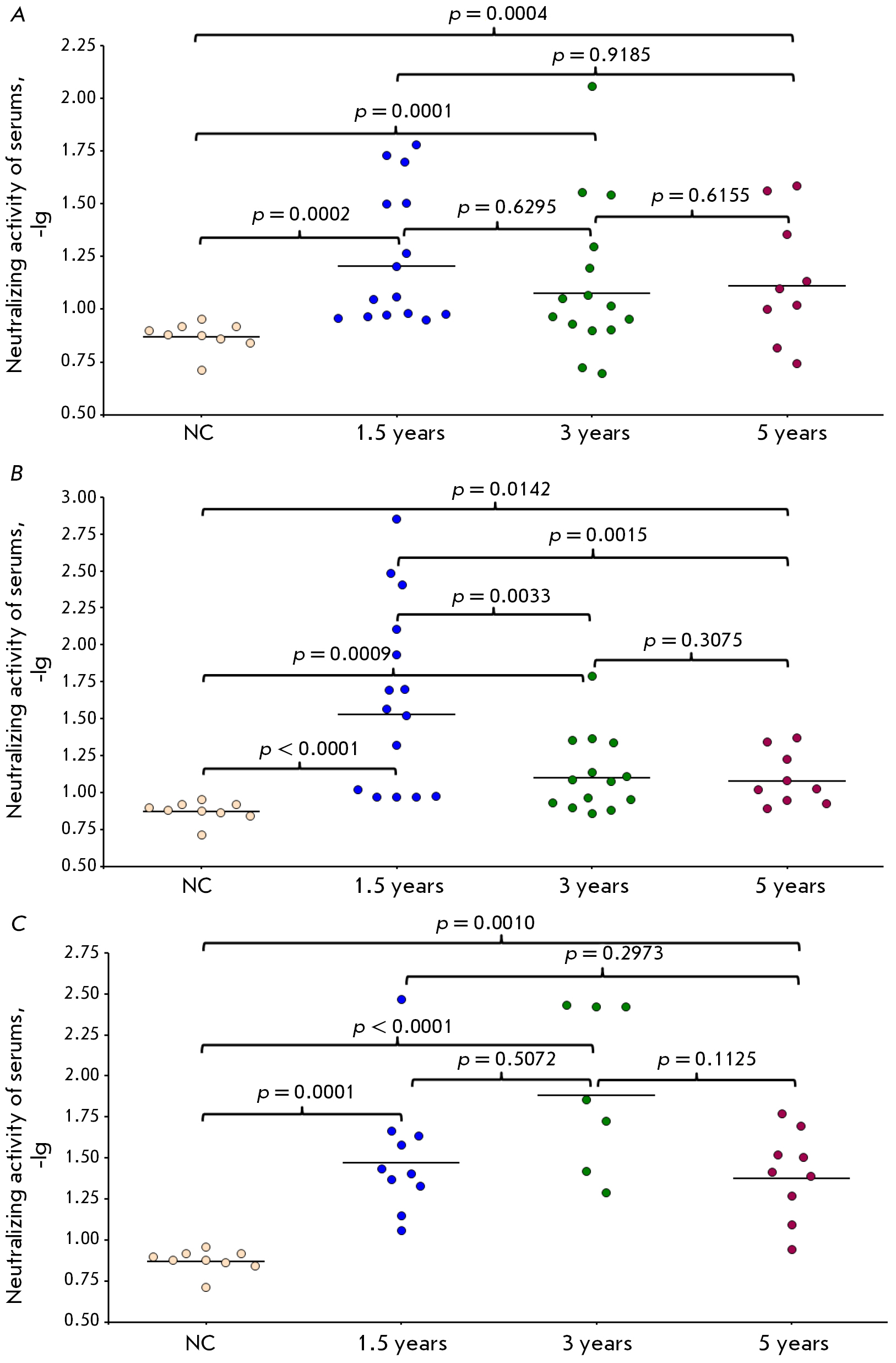 Fig. 4. The neutralizing activity of the blood sera of volunteers vaccinated in phases I and II/III clinical studies of the OrthopoxVac vaccine. Virus-neutralizing antibody titers were assessed via the plaque reduction assay of VACV (strain L-IVP) on CV-1 cell cultures. The data are presented in the form of -lg, with each point representing a single volunteer and horizontal lines indicating the levels of GMT of antibodies in the groups. The significance of the differences between the groups was determined by the F criterion. Presented are data on VNA titers at 1.5, 3, and 5 years post-vaccination for: (A) group – volunteers vaccinated once intradermally with the OrthopoxVac vaccine at a dose of 107 PoFU/0.2 mL; (B) group – volunteers vaccinated twice with an interval of 28 days intradermally with the OrthopoxVac vaccine at a dose of 106 PoFU/0.2 mL; (C) group (positive control) – volunteers vaccinated with a two-stage technique: inactivated smallpox vaccine and then Smallpox live vaccine; NC group (comparison group, negative control) – volunteers who were not vaccinated with smallpox vaccines, were not in contact with patients vaccinated with smallpox vaccines, and did not work with viruses of the genus Orthopoxvirus