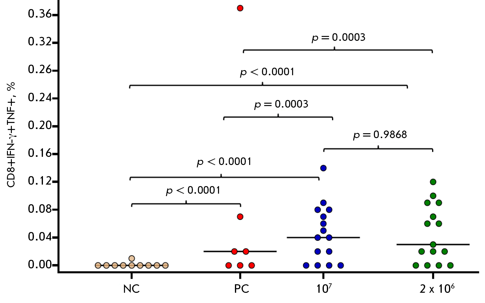Fig. 5. The percentage of VACV-specific CD8+ T cells producing FN-γ and TNF in PBMC samples from volunteers vaccinated with the smallpox vaccine in clinical studies 1.5 years after vaccination. NC group (comparison group, negative control) – volunteers not vaccinated with smallpox vaccines, with no contact with patients vaccinated with smallpox vaccines, and who did not work with viruses of the genus Orthopoxvirus; PC group (positive control) – volunteers vaccinated by the two-stage method with the smallpox-inactivated OspaVir vaccine and after 7 days with the live smallpox vaccine based on the L-IVP strain (Microgen); 107 group – volunteers vaccinated once intradermally with the OrthopoxVac vaccine at a dose of 107 PoFU/0.2 mL; 2 × 106 group – volunteers vaccinated twice with a 28-day interval, intradermally at a dose of 106 PoFU/0.2 mL. The significance of the differences between the groups was determined by the F criterion. Each point represents a single volunteer