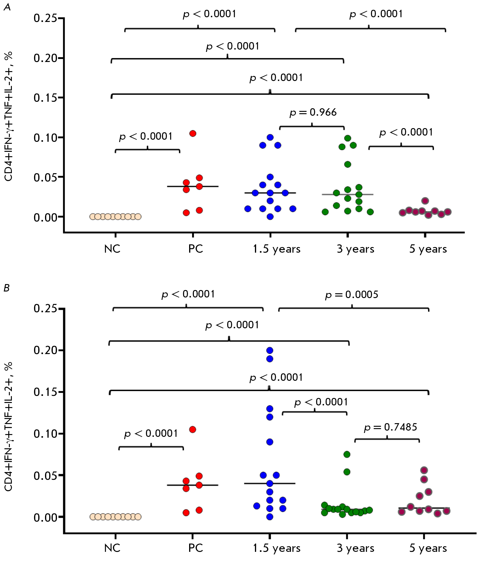 Fig. 6. The percentage of VACV-specific CD4+ T cells producing IFN-γ, TNF, and IL-2 in PBMC samples from volunteers vaccinated with the smallpox vaccine in clinical studies. (A) group – volunteers vaccinated once intradermally with the OrthopoxVac vaccine at a dose of 107 PoFU/0.2 mL; (B) group – volunteers vaccinated twice with an interval of 28 days intradermally at a dose of 106 PoFU/0.2 mL; NC group (comparison group, negative control) – volunteers not vaccinated with smallpox vaccines, with no contact with patients vaccinated with smallpox vaccines, and did not work with viruses of the genus Orthopoxvirus; PC group (positive control) – volunteers vaccinated by two-stage method with the smallpox inactivated OspaVir vaccine and after 7 days with live smallpox vaccine based on the L-IVP strain (Microgen). The significance of the differences between the groups was determined by the F criterion. Each point represents a single volunteer