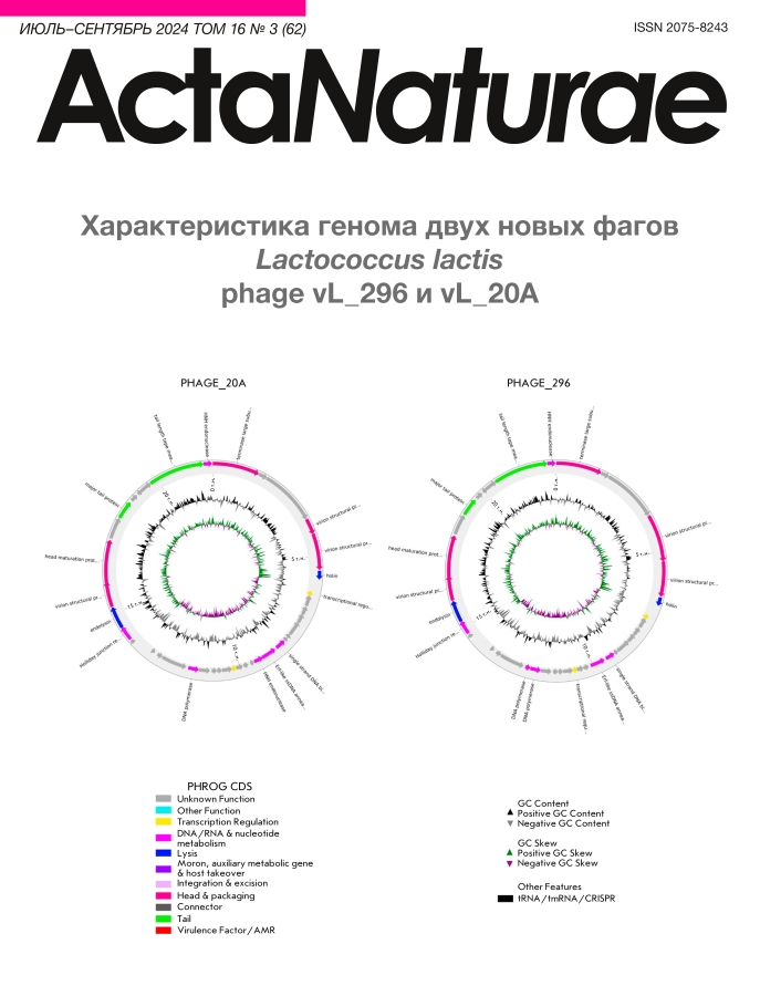 Производство ферментированных молочных продуктов основано на использовании заквасочных культур, которые сквашивают молоко с образованием продукта с определенной текстурой, ароматом и вкусом. Однако используемые в производстве молочнокислые бактерии подвержены инфицированию бактериофагами. Изучали геномы двух бактериофагов, выделенных из подсырной сыворотки при производстве сыров. Определили видовую принадлежность и литический спектр этих бактериофагов. Фаги vL_20А и vL_296, выделенные с использованием индикаторных культур лактококков, обладают уникальными литическими спектрами: только четыре бактерии-хозяина из 21 возможной выявленной у них общие. Геномы vL_20A и vL_296 состоят из линейной ДНК длиной 21909 и 22667 п.н. соответственно. Наиболее похожим на фаги vL_20A и vL_296 оказался Lactococcus phage bIL67 (ANI 93.3 и 92.6 соответственно). Анализ спейсеров CRISPR в геномах заквасочных культур не выявил среди них специфичных к фагам vL_20A и vL_296. Это исследование подчеркивает биоразнообразие фагов L. lactis, а также широкое присутствие фагов на молочных заводах и их вирулентность. Однако вирулентность фагов уравновешивается наличием в ряде заквасочных культур значительного количества штаммов бактерий, обладающих благодаря системе CRISPR-Cas различной чувствительностью к фагам.