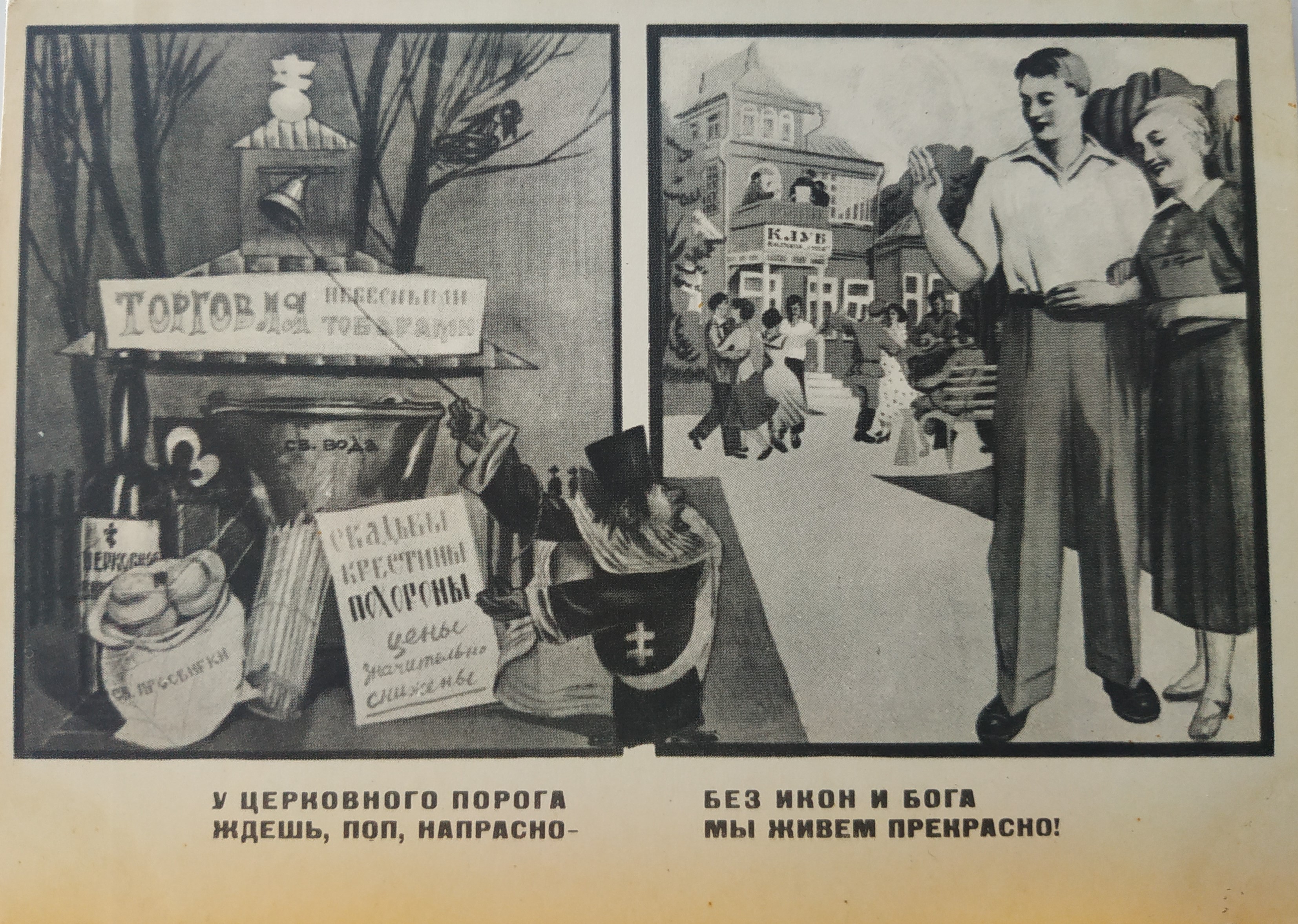 В этом контексте интересна опубликованная в 1963 г. в издательстве «Советский художник» серия открыток на антирелигиозную тему, в которой религия и церковь обличаются как архаичное явление жизни, от которого следует дистанцироваться (рис. 1‒4)35.