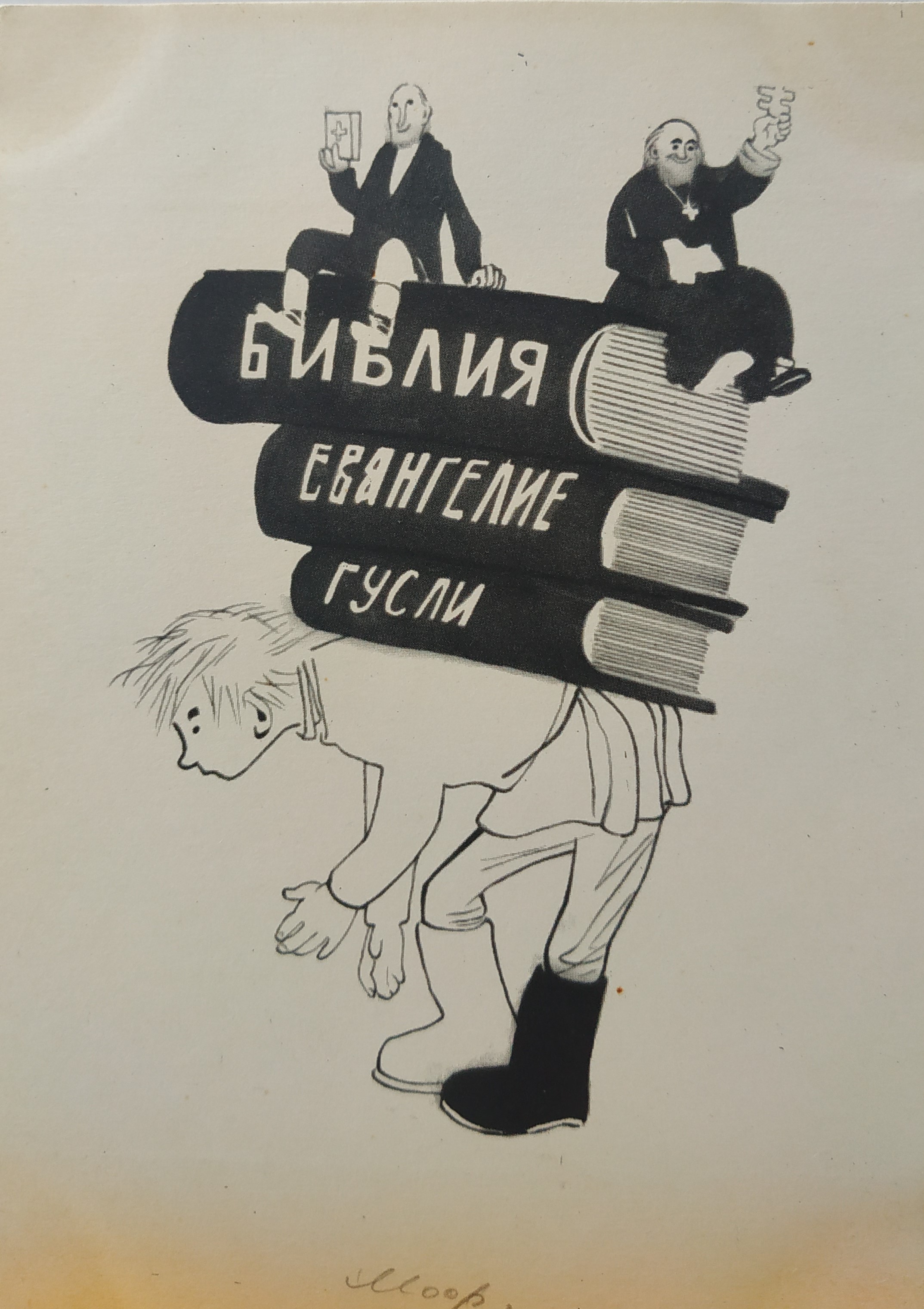 Церковники, православные и протестантские, изображены как нахлебники, «сидящие на шее» у народа. А «груз» с надписью «гусли» (рис. 3) призван символизировать отказ от архаичных традиций, в числе которых находится и религия.