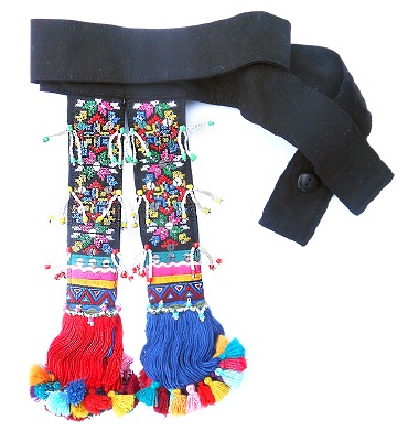 - Помимо тканых поясов, у марийцев существовали шитые и покупные пояса, которые отличались технологией изготовления и материалами. Шитые пояса создавались из покупной ткани (обычно черной) и украшались вышитыми узорами. Их характерной особенностью были два длинных вышитых конца, на которые нашивалась декоративная тесьма (рис. 4). Концы могли дополняться пышными кистями из разноцветных нитей с бисером или монетами. Покупные пояса приобретались на ярмарках и базарах. Среди них выделялись: пазар ӱштӧ ‘ярмарочный пояс’, рушла ӱштӧ ‘русский пояс’. Они часто ткались на станках, могли украшаться орнаментами, надписями, полосатыми узорами. Для их создания использовали шерсть, гарус и другие материалы. Цветовые сочетания варьировались от ярких градиентных переходов до однотонных фоновых узоров с контрастными вставками.