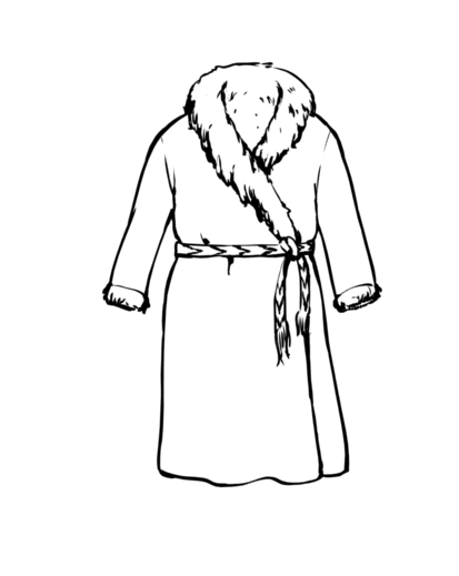 Для защиты дорожного костюма от загрязнений карелы использовали балахон (с-к. palahvana; ливв. balahon; люд. balaffon) из домотканого холста, имевший свободный крой, широкие рукава и капюшон-кукель (kukkel’)25. Балахон использовался весь год, надеваясь поверх как летней, так и зимней верхней одежды. В зимний период поверх кафтана в дорогу надевали тулуп (с-к. tuluppa; ливв. tuluppu; люд. tulupp), а среди южных групп карелов был распространен армяк (ливв. ärmäkkö)26. Тулуп и армяк имели схожий халатообразный покрой с удлиненным подолом, запáх правой полы на левую, а застежкой служил кушак27. Различие между ними было в материале пошива: армяк выполнялся из сукна (рис. 1), тулуп – из овчины (рис. 2)28. Данный тип верхней одежды благодаря длинному подолу защищал ноги карелов от холода при длительной езде в санях29. Согласно материалам экспедиции 1957 г. под руководством Р. Ф. Тароевой, в тулупе или «шубе едут до места работ. А работают в понитке»30. Таким образом, тулуп, армяк и балахон служили специальной верхней дорожной одеждой карелов.