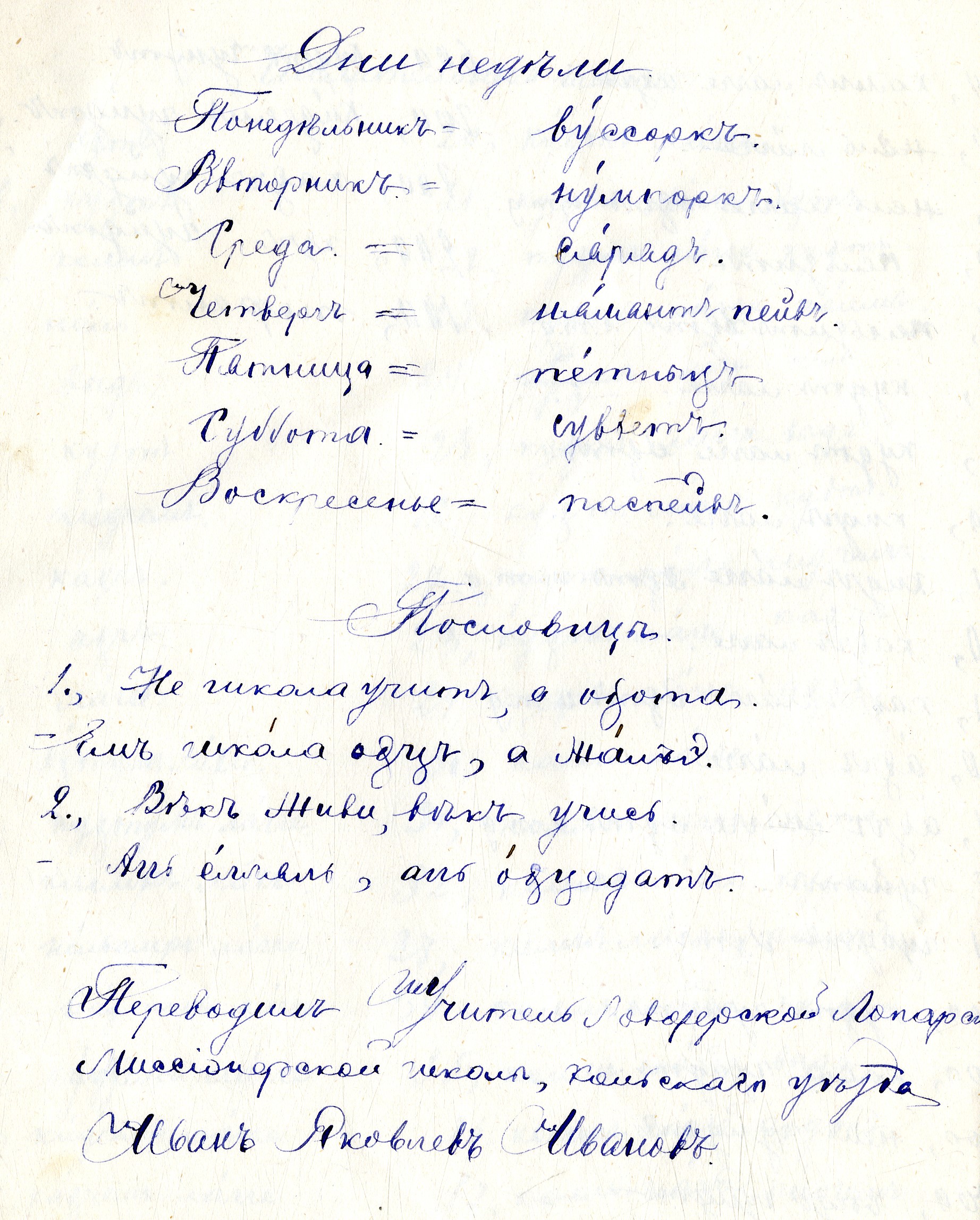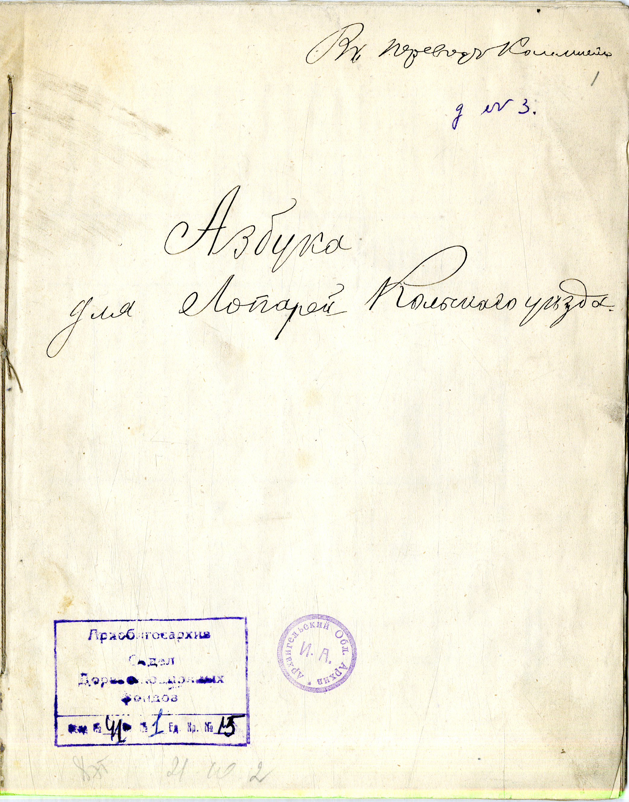 Примером успешной социальной адаптации может служить профессиональная биография учителя Ловозерской школы Ивана Яковлевича Иванова. Он происходил из известной в Архангельской губернии священнической династии Ивановых, но, окончив только первый класс Архангельской семинарии, был вынужден искать место учителя. В 1893 г. он был определен в школу в Ловозерском погосте, где преподавал до 1897 г. Все это время школа не имела собственного здания, а помещалась в «лопарской тупе», где камелек был переделан в русскую печь, а доска висела у печи на веревочках. Учитель проживал в погосте только в зимнее время, а весной до распутицы уезжал из погоста до осени к родным в Архангельск. Несмотря на короткий срок проживания в погосте и неоконченное образование, Иван Яковлевич освоил местный диалект и даже составил «Азбуку для лопарей Кольского уезда» (рис. 1), которая сохранилась в рукописи в фонде Переводческой комиссии при Архангельском миссионерском комитете Государственного архива Архангельской области18. Как свидетельствуют документы, Иван Яковлевич владел и зырянским языком19. Эта необходимость была обусловлена преобладанием в Ловозерской школе детей коми-ижемцев [10]. В 1897 г. Иван Яковлевич Иванов перевелся на службу в Чуболонаволоцкий приход недалеко от Архангельска, однако, женившись вскоре на дочери протоиерея Елизавете Алексеевне, оставил учительскую службу и был рукоположен в сан священника.