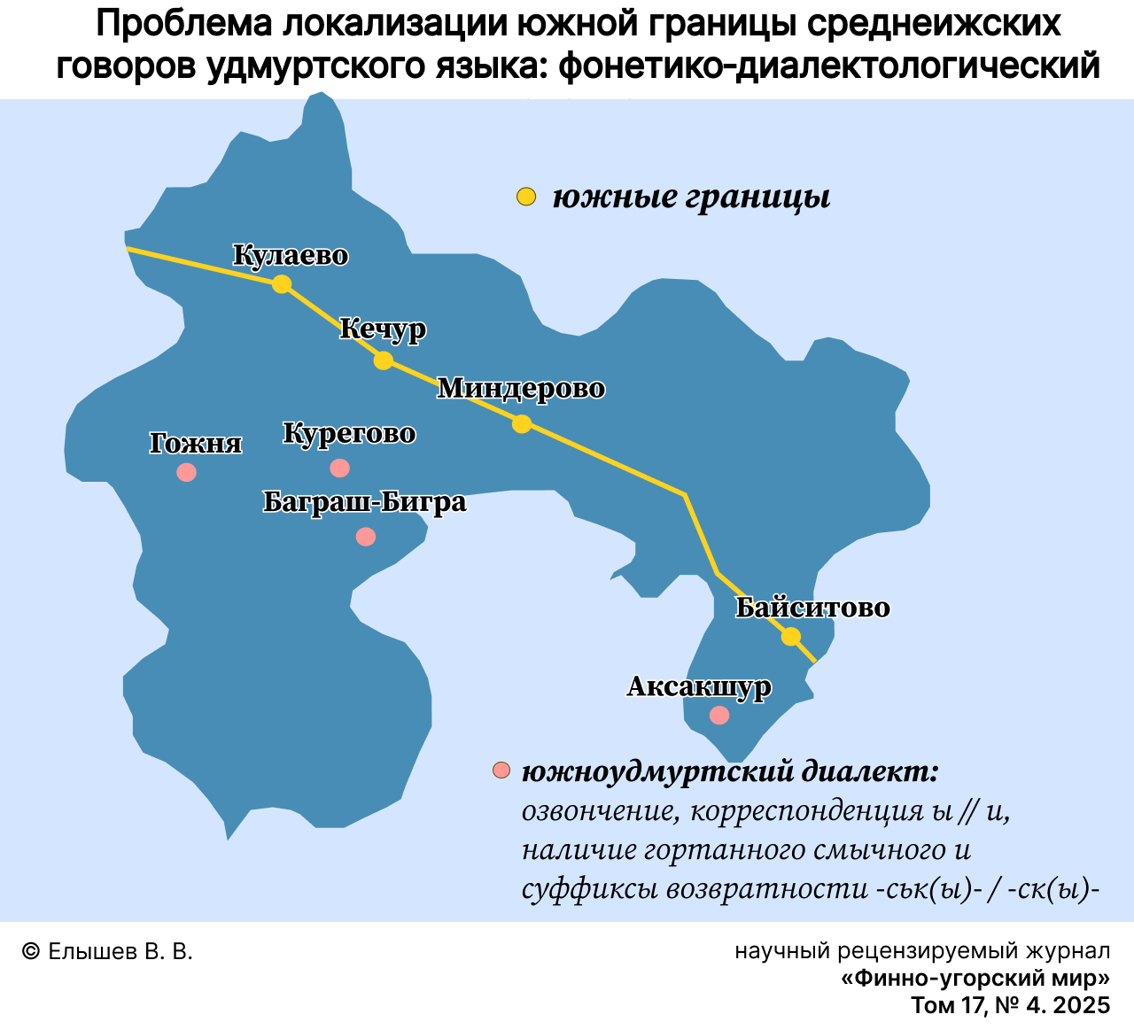 Введение. Актуальность исследования обусловлена малоизученностью срединных говоров удмуртского языка в удмуртской диалектологии, а также активной ассимиляцией и нивелированием диалектных особенностей рассматриваемого языка в современных условиях. В связи с этим особую значимость приобретают задачи комплексного исследования диалектных пространств, в том числе по определению границ срединных говоров. Четкое выделение ареала их распространения позволяет не только описывать и сравнивать диалектные идиомы, но и реконструировать лингвистические и исторические процессы, характерные для удмуртского языка. Цель исследования – определить южную границу среднеижских говоров, расположенных в переходной зоне между срединными говорами и южным диалектом удмуртского языка, путем выявления их фонетико-морфологических особенностей.