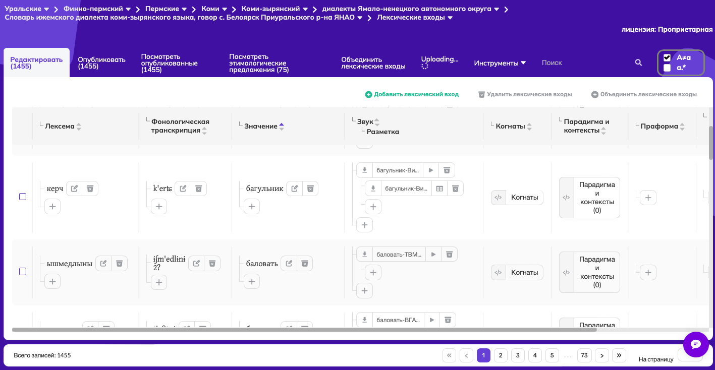 На сайте LingvoDoc в настоящее время размещено более 40 словарей по коми языку, в том числе 14 аудиословарей и 12 словарей по письменным памятникам5. Один из наиболее объемных словарей по ижемскому диалекту – аудиословарь говора с. Белоярск Приуральского района Ямало-Ненецкого Автономного Округа6 был записан в ходе экспедиции 2012–2013 гг. под руководством Е. В. Кашкина в рамках проекта по разработке диалектологического атласа уральских языков ЯНАО (руководитель ‒ Н. Б. Кошкарева). Данный аудиословарь состоит из 1 455 лексических входов (лексема, фонологическая транскрипция, значение, аудиозапись, парадигмы и контекст, когнаты). Большинство аудиозаписей снабжены разметкой, выполненной в программе Praat (рис. 2). Необходимо учесть, что сбор базисной лексики, являющейся основой для сравнительно-исторического языкознания, требует разработки специальных методик, что было продемонстрировано на материале казымского диалекта хантыйского языка [6].